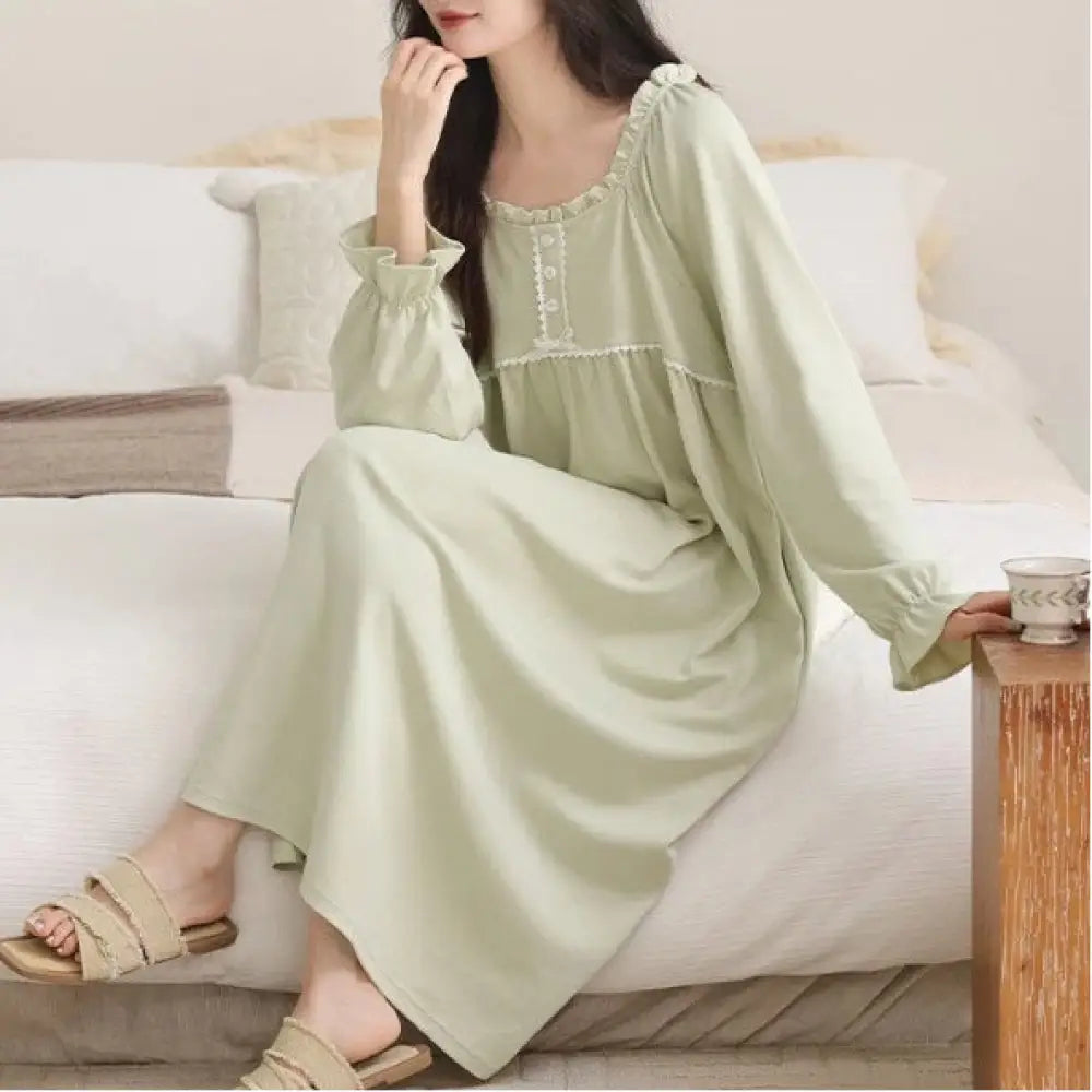 春秋 レディース 綿 長袖 コットン ナイトガウン パッド付き パジャマ ルームウェア 薄手 柔らか 入院 出産 部屋着 寝巻き ID4276