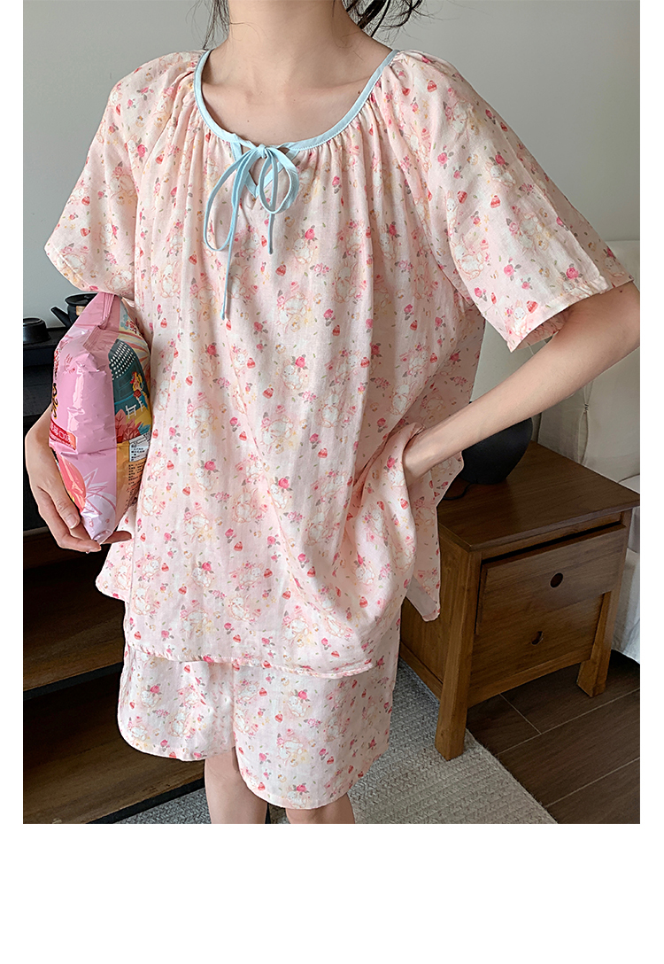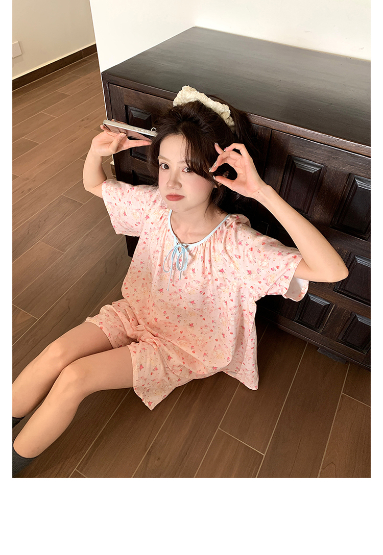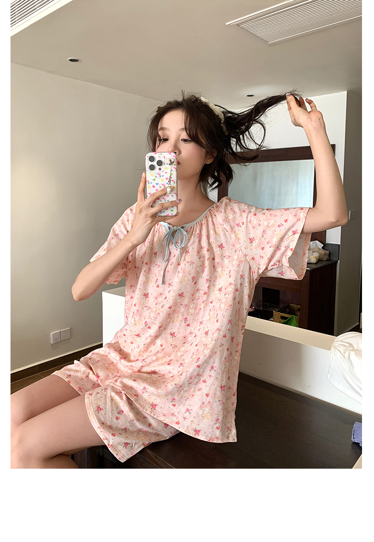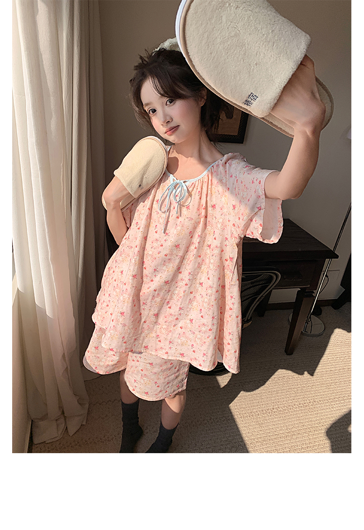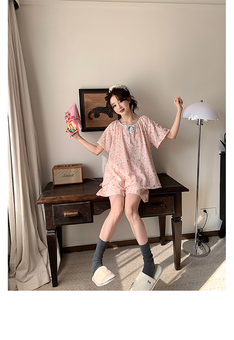 カントリー花柄 リボンタイ パジャマセット レディース 夏用 半袖&ショートパンツ ゆったり 快適 ルームウェア ID1432