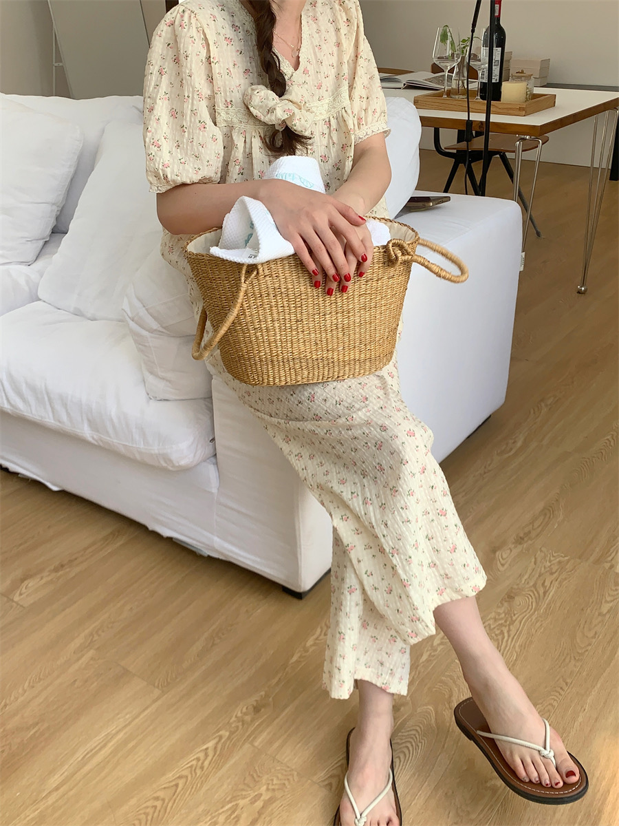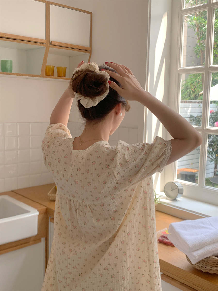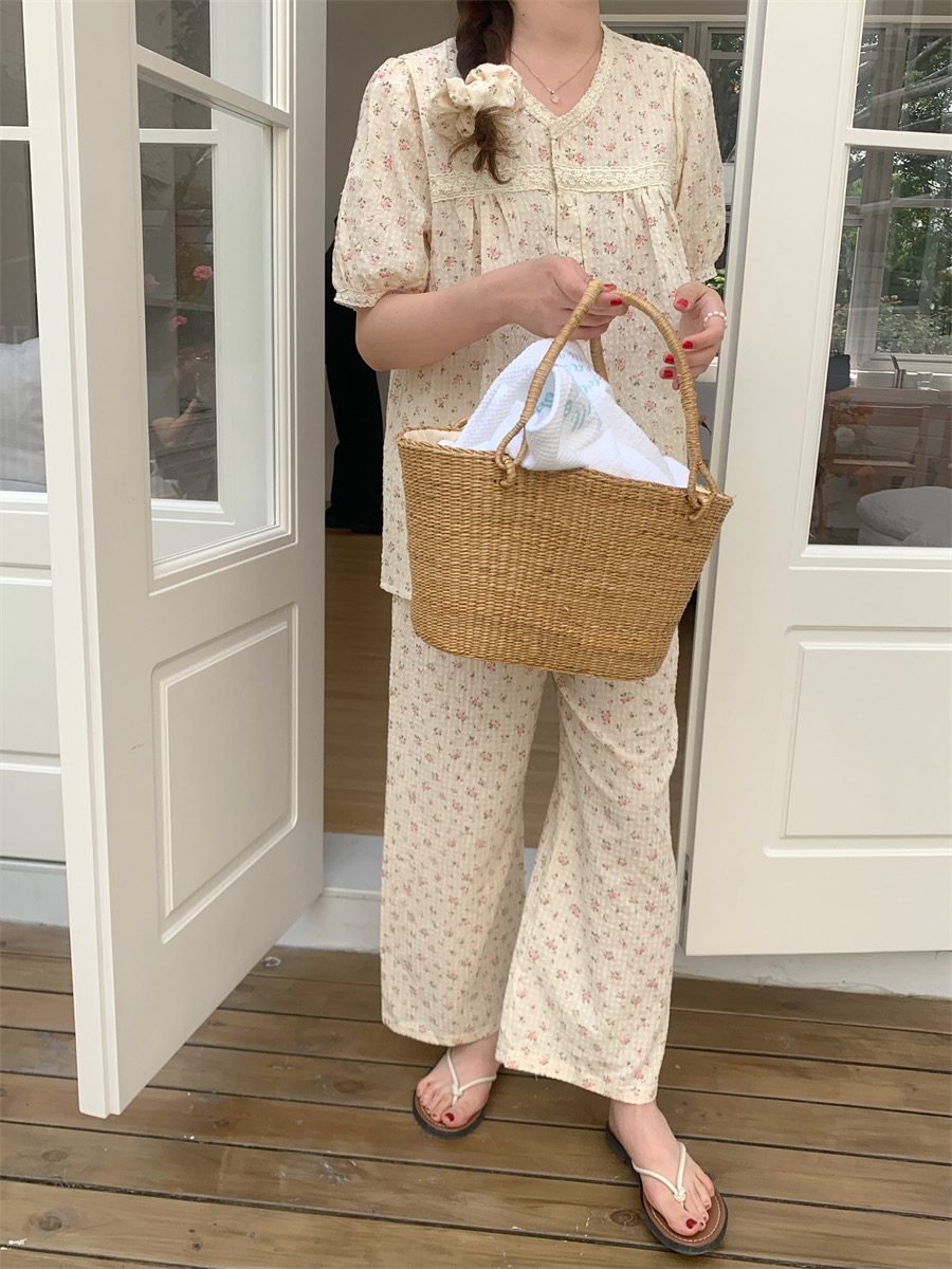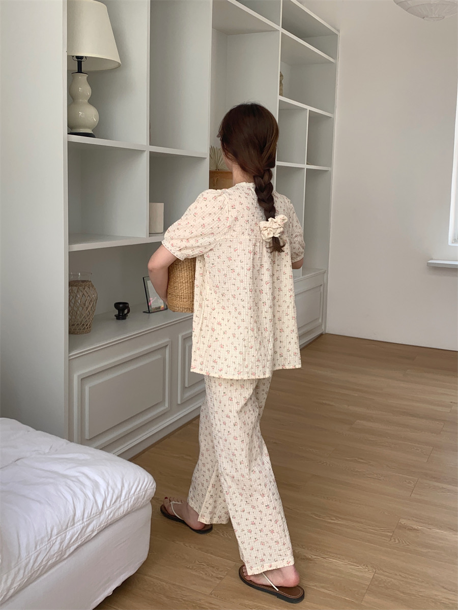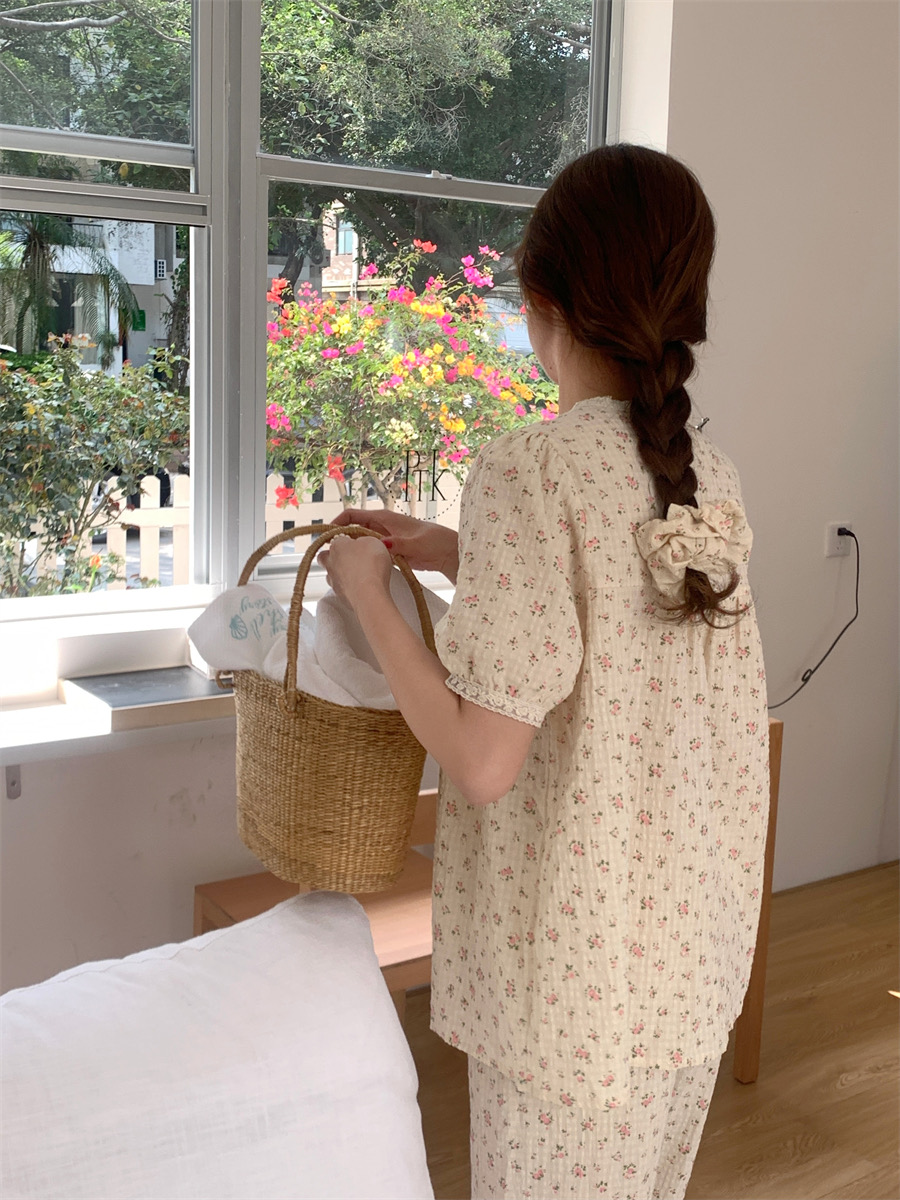 夏用 レディース 綿 半袖 長パンツ パジャマセット 田園風 かわいい 小花柄 レーストリム リラックス ルームウェア 学生用 ID1444