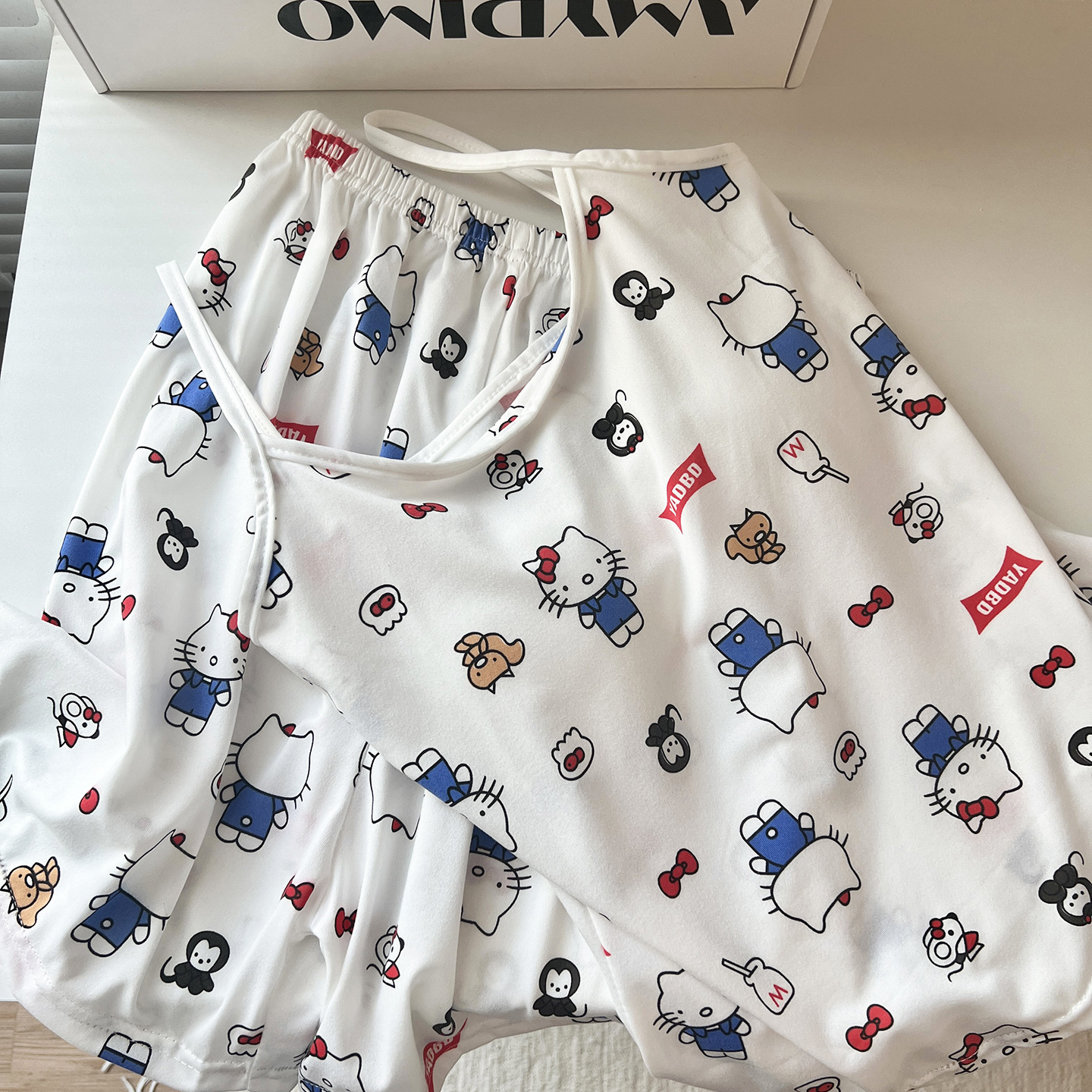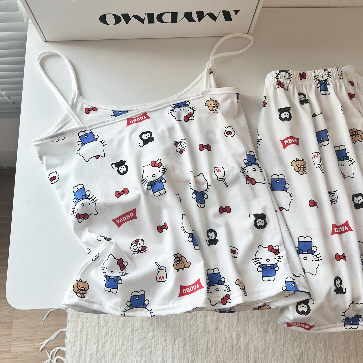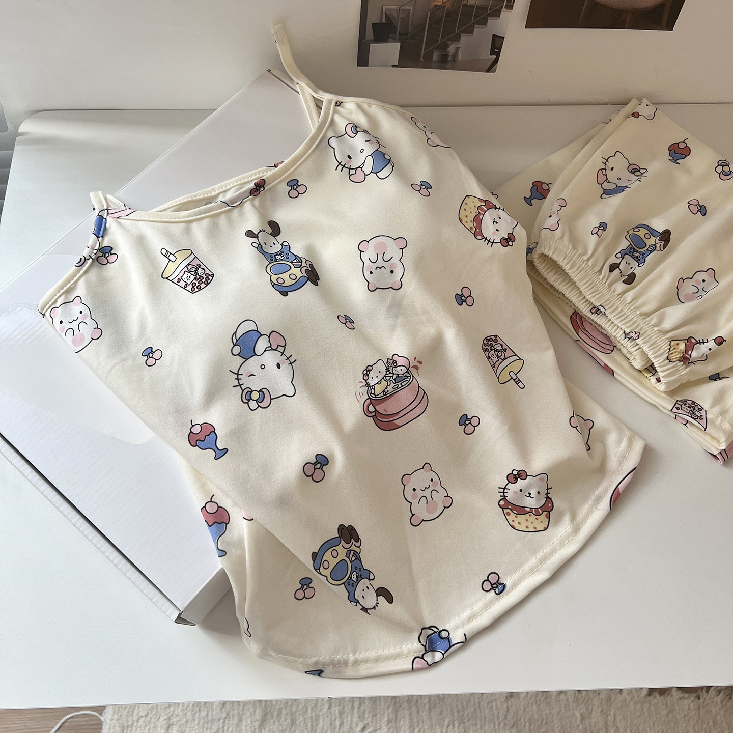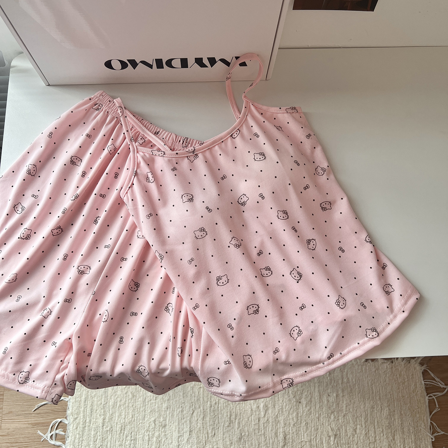 早割特典 パッド付き ハローキティ ブルー ストラップパジャマ ショートパンツセット おうちカフェ 外出対応 薄手涼感 サマーコーデ 女子ごころ ID1467