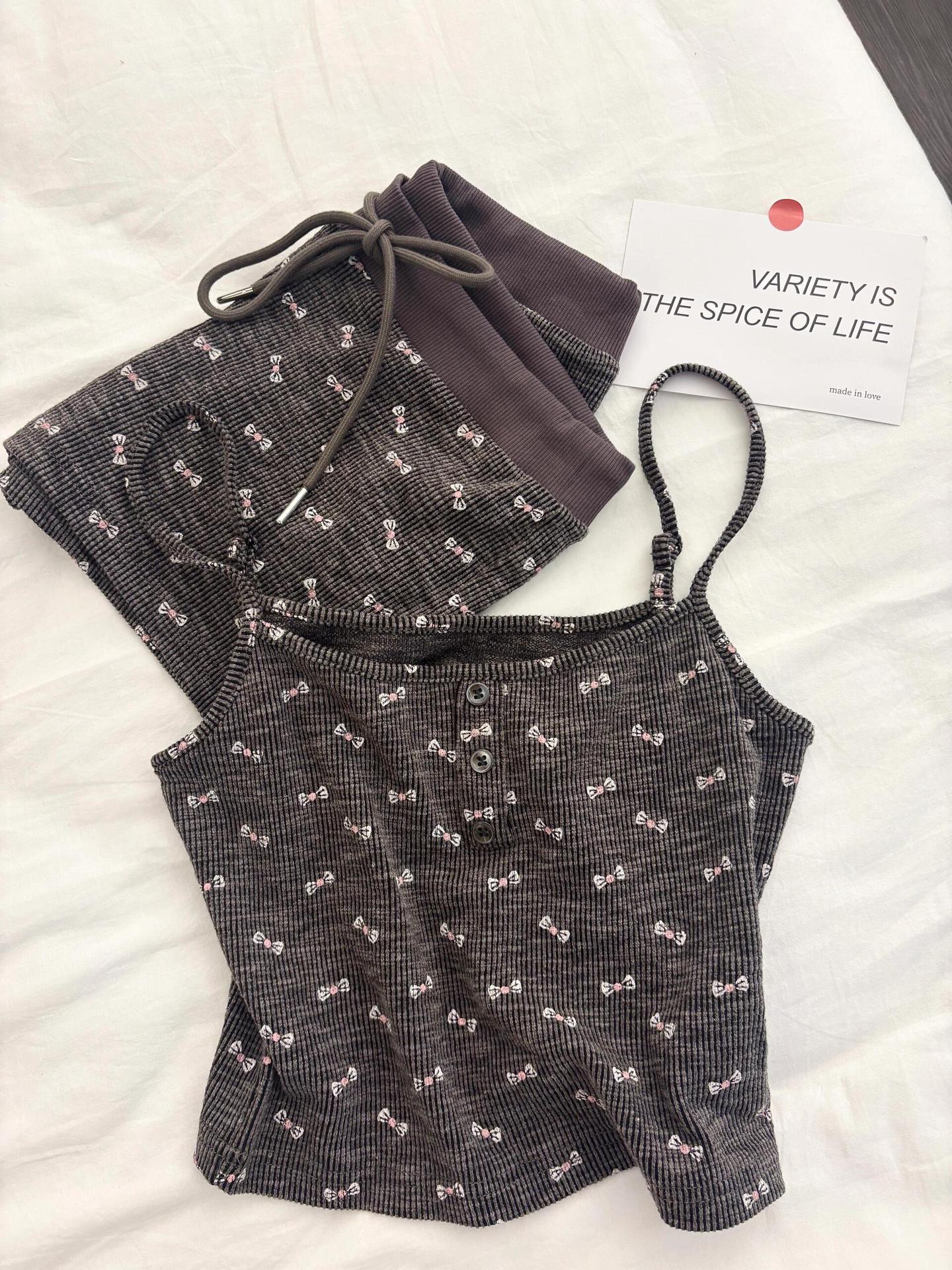 ボウタイ プリント スリップ パジャマ 女性用 夏季 新作 少女 セクシー ベスト ショートパンツ 居家 セット 外出着 ID1525