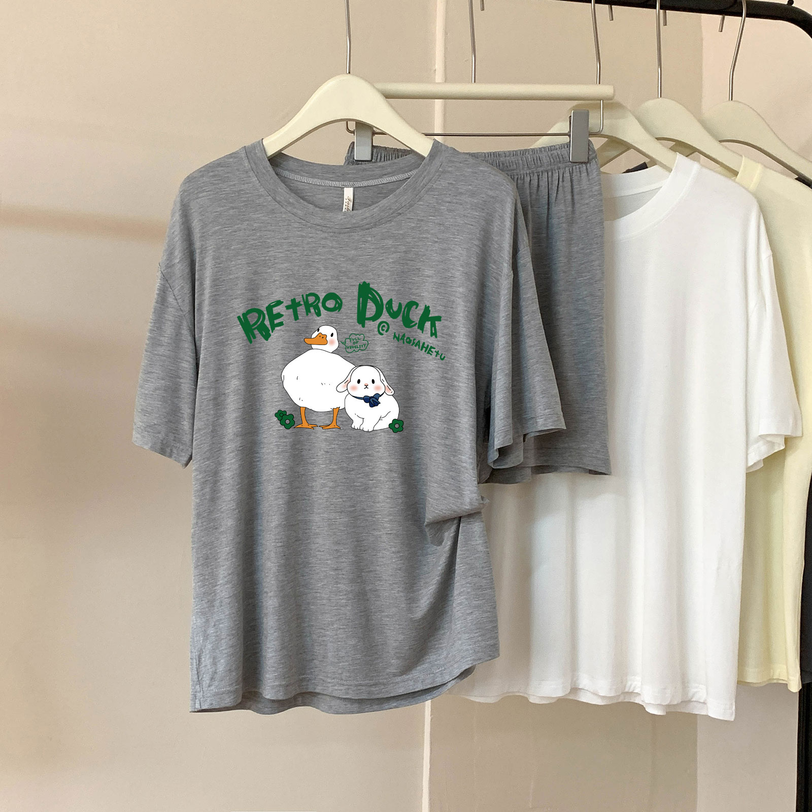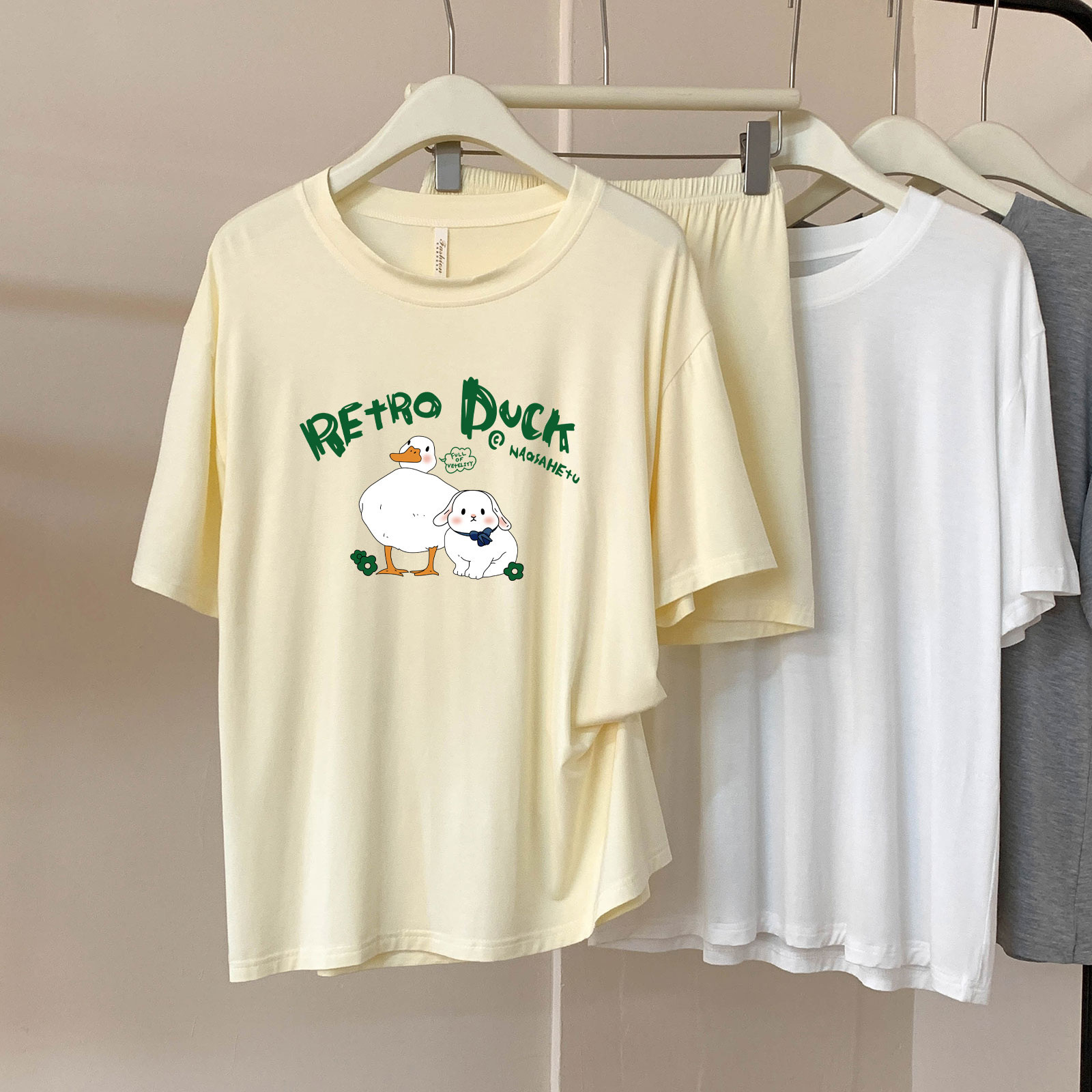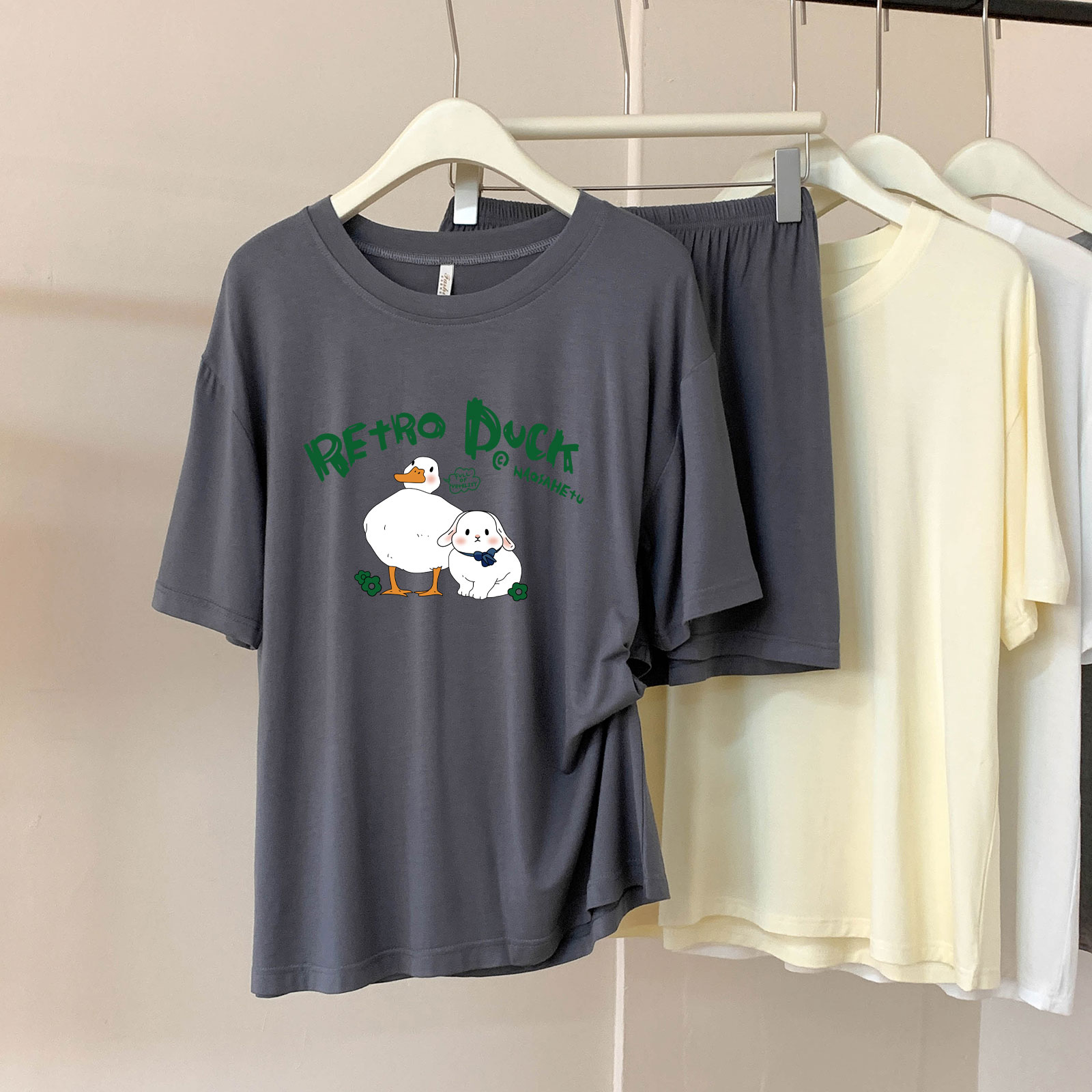 カートゥーン かわいい 小さなアヒル モダール コットン ラウンドネック 半袖 ショートパンツ パジャマ レディース 新作 2点セット ルームウェア ID1592