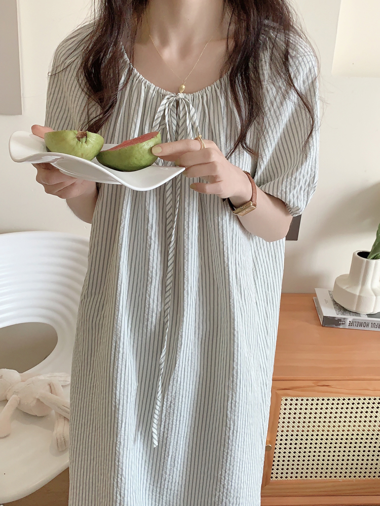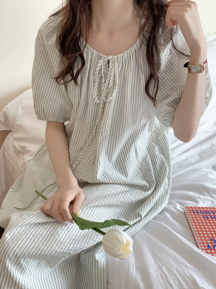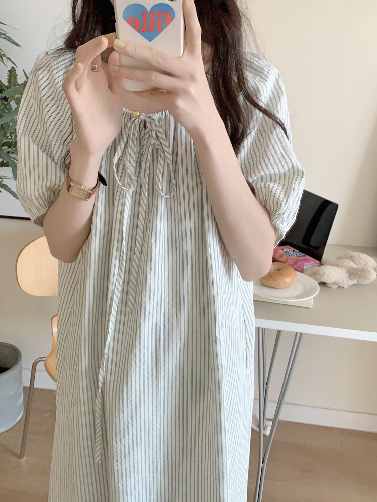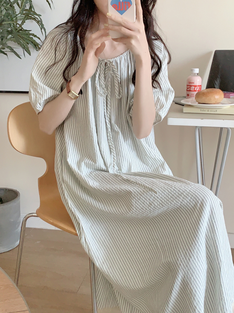韓国風 リボン付き ストライプ柄 ナイトドレス レディース 夏 2025新作 半袖 パジャマ ゆったり シンプルデザイン ルームウェア 外出可 ID1615