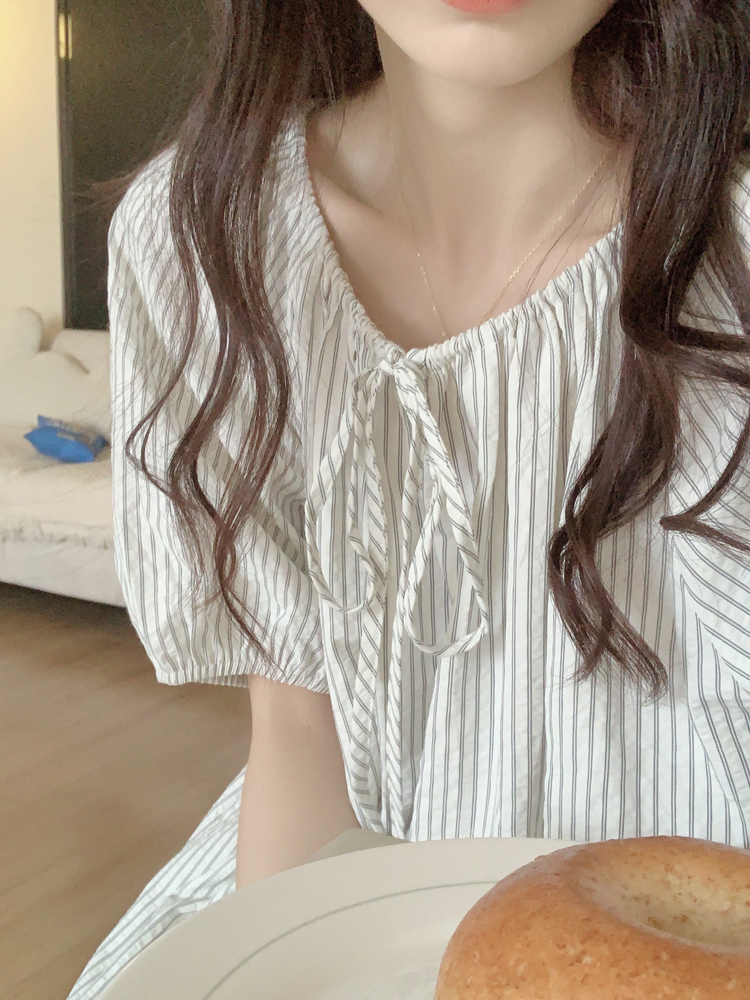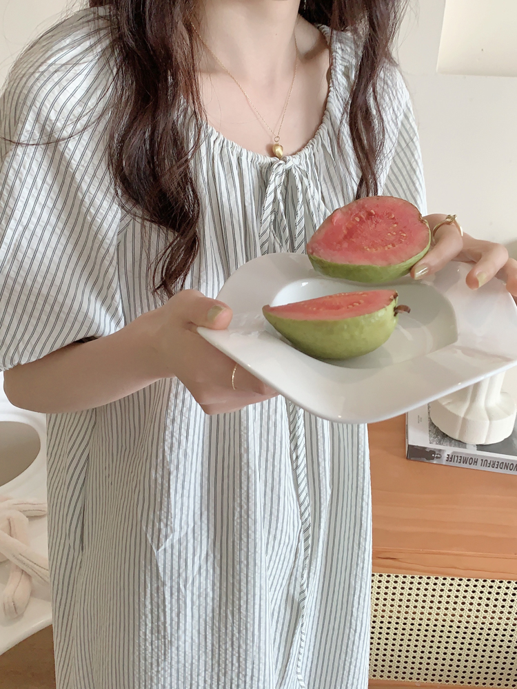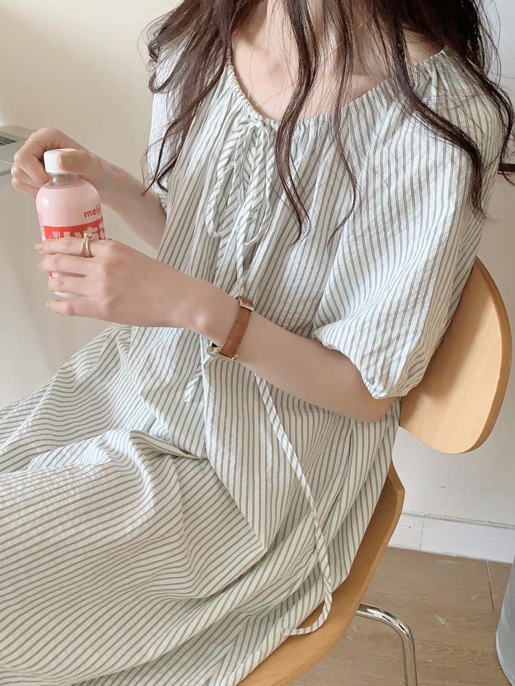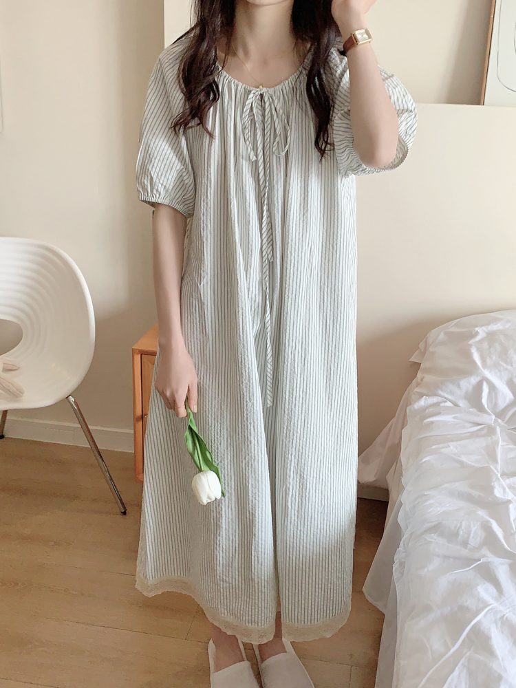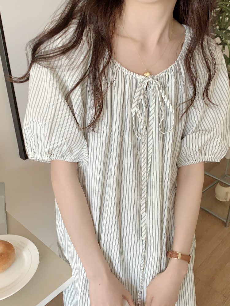 韓国風 リボン付き ストライプ柄 ナイトドレス レディース 夏 2025新作 半袖 パジャマ ゆったり シンプルデザイン ルームウェア 外出可 ID1615
