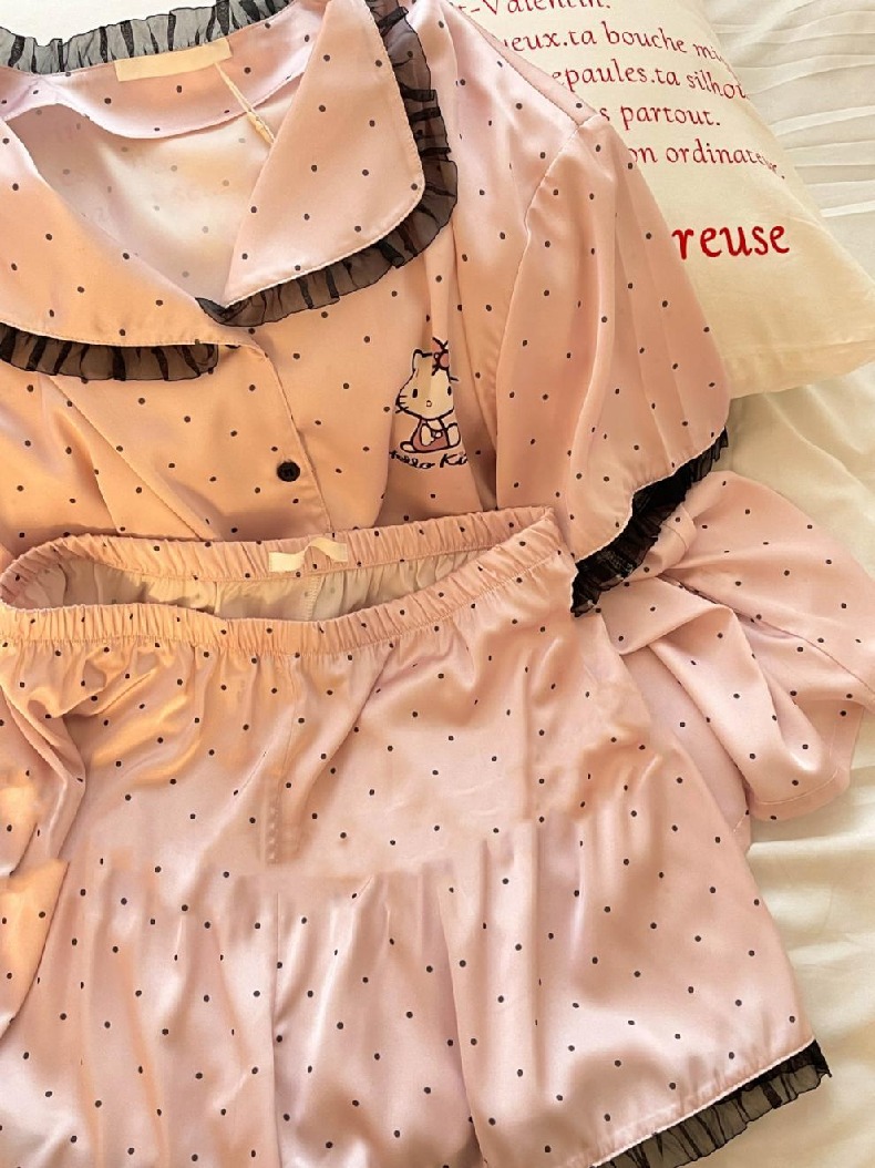 ハローキティ レース 水玉 パジャマセット レディース 夏 新作 半袖 ジャパニーズスタイル 学生 ルームウェア 外出着可 可愛い 涼感 通気性 ID1640