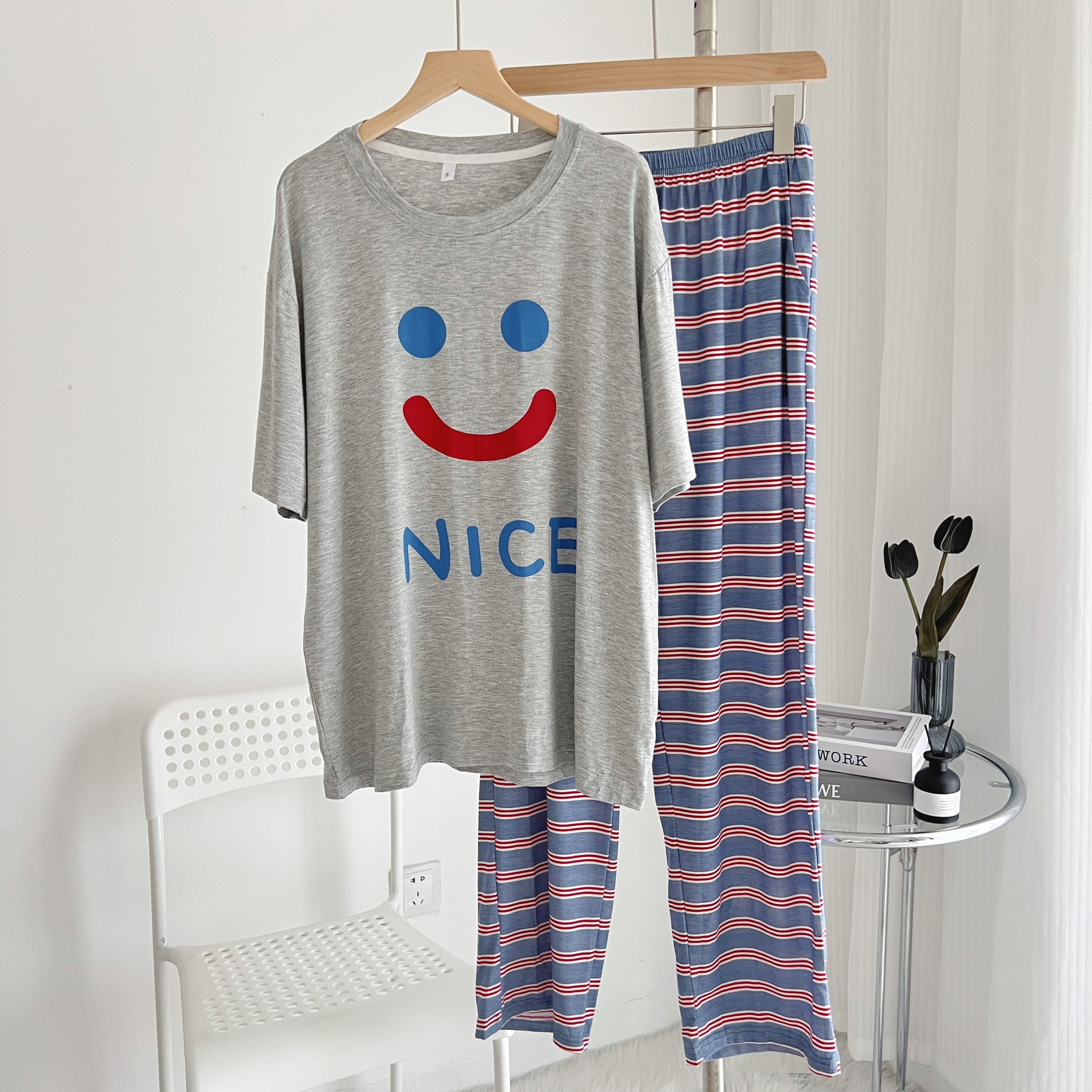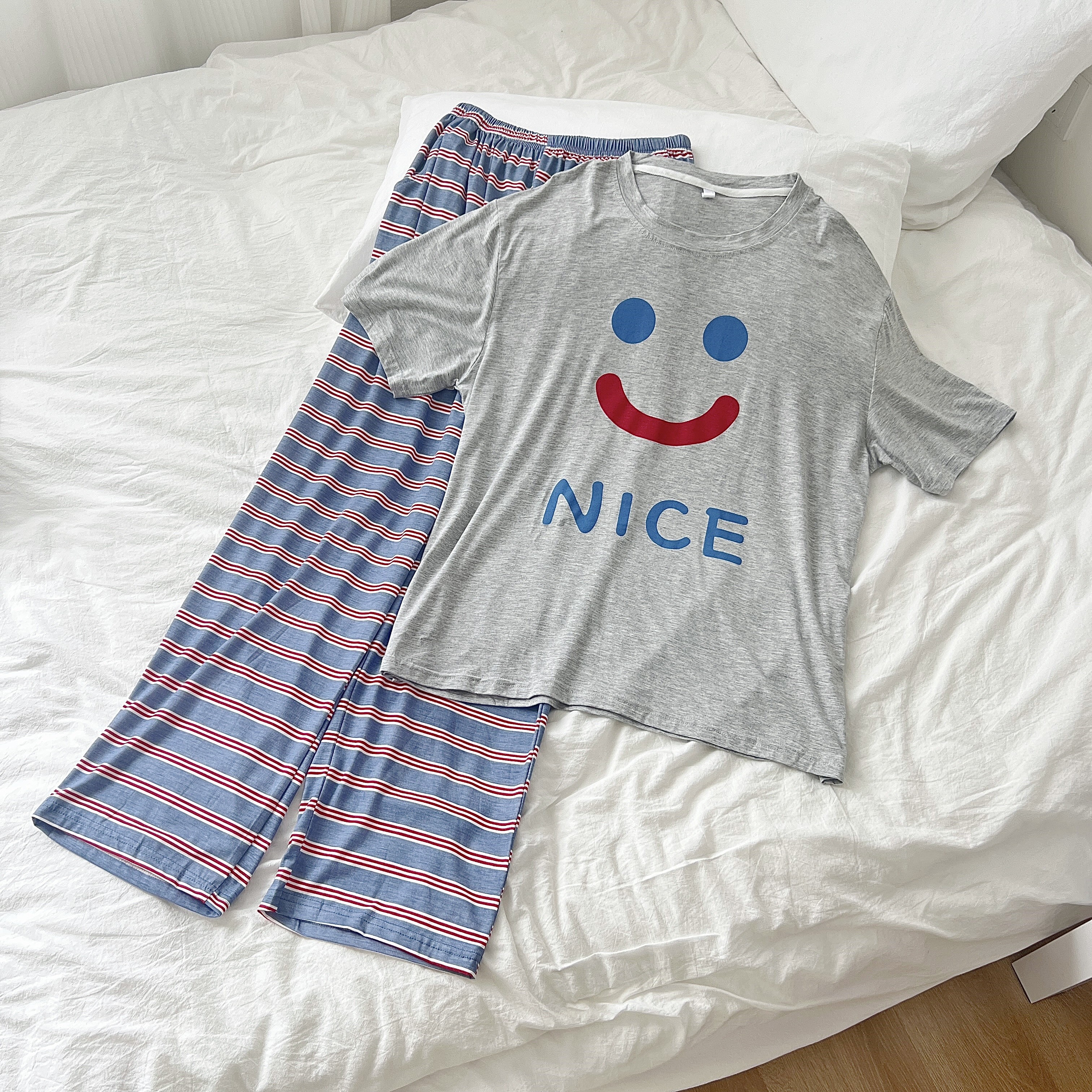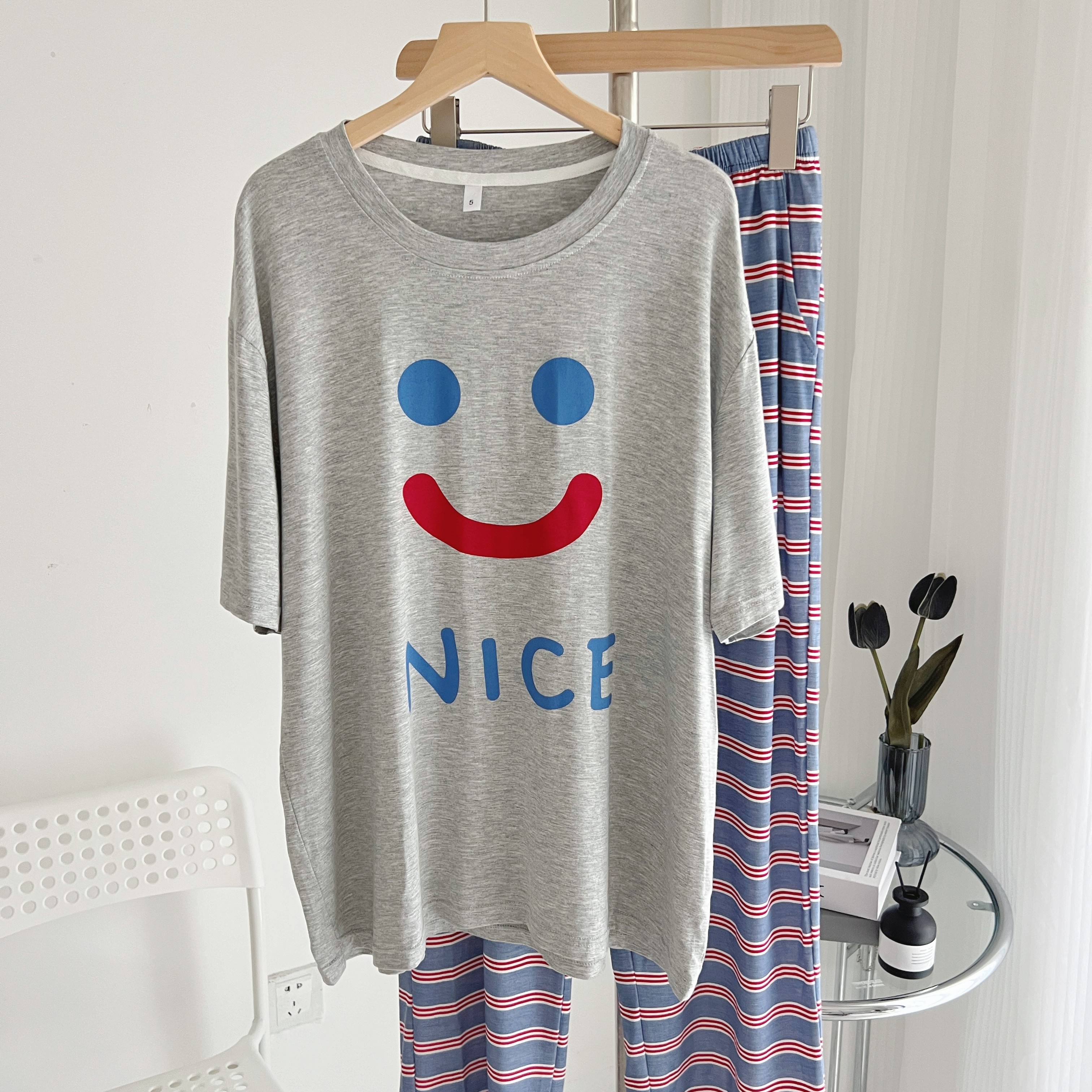 スマイルフェイス モダール パジャマセット 半袖トップス&ショートパンツ 丸首 甘カワ お出かけOK 女子に人気 涼感 通気性バツグン ID1685