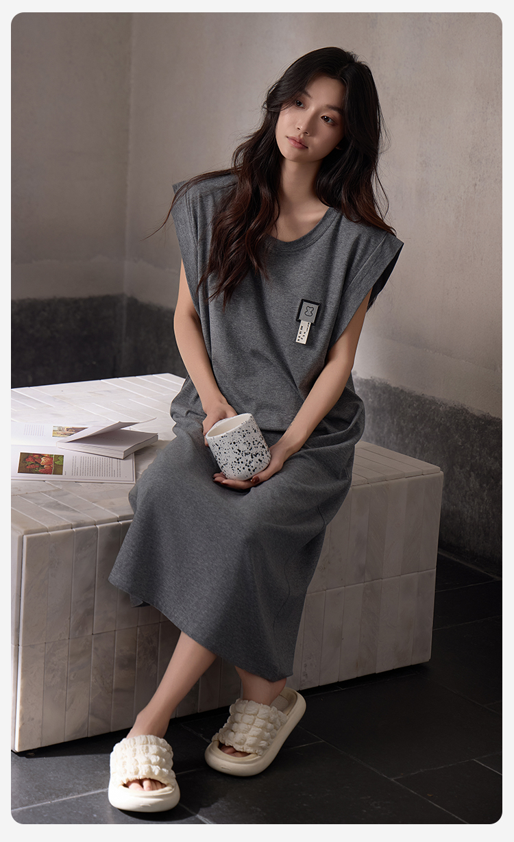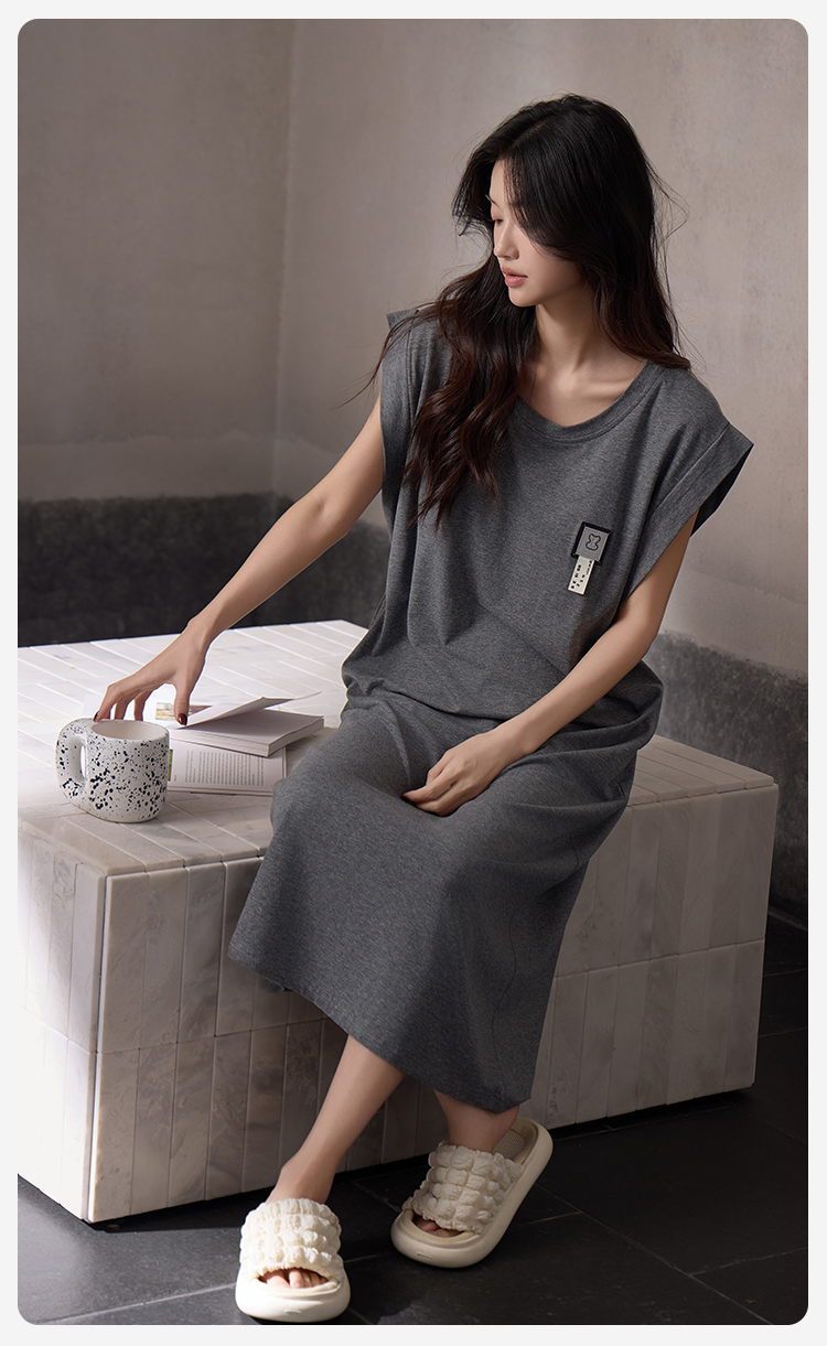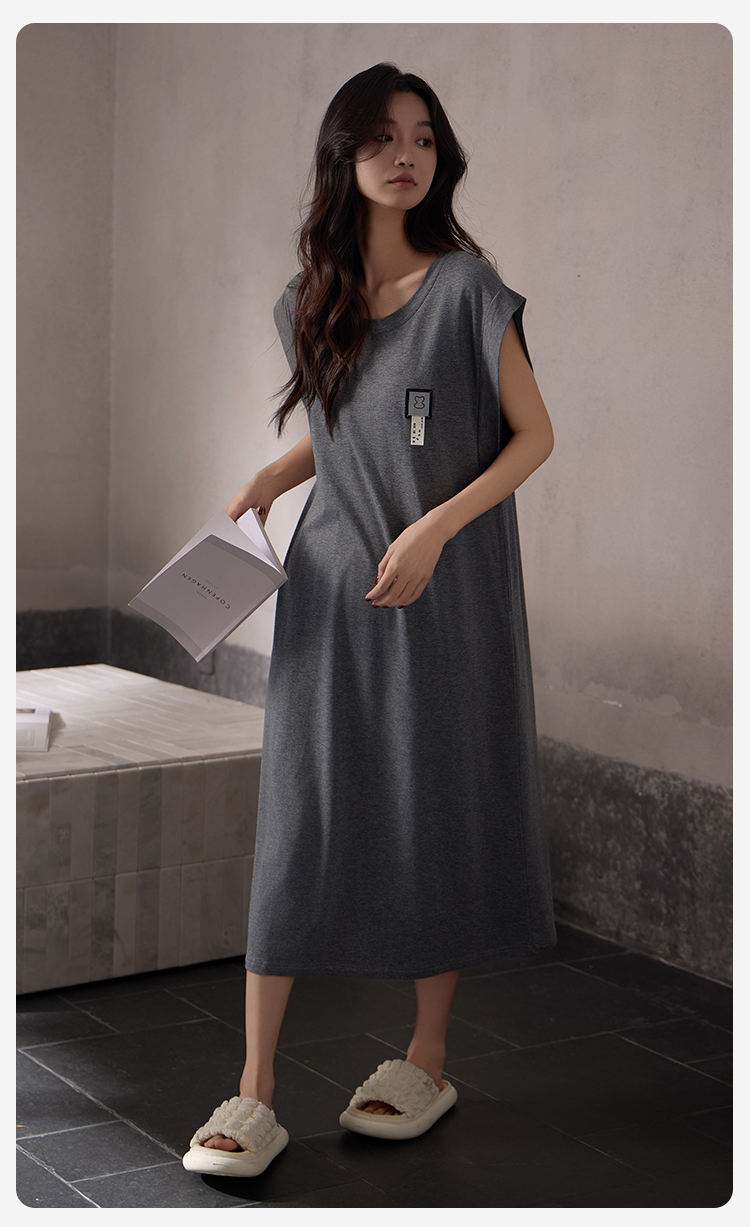 胸当てパッド付き モダール ワンピース パジャマ ノンスリーブ 薄手 ゆったり ミディ丈 シンプルデザイン 家居着 女性用 2XLサイズまで ID1706