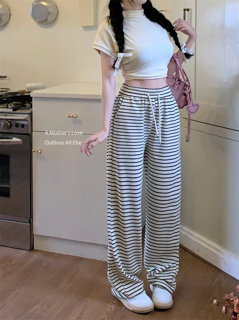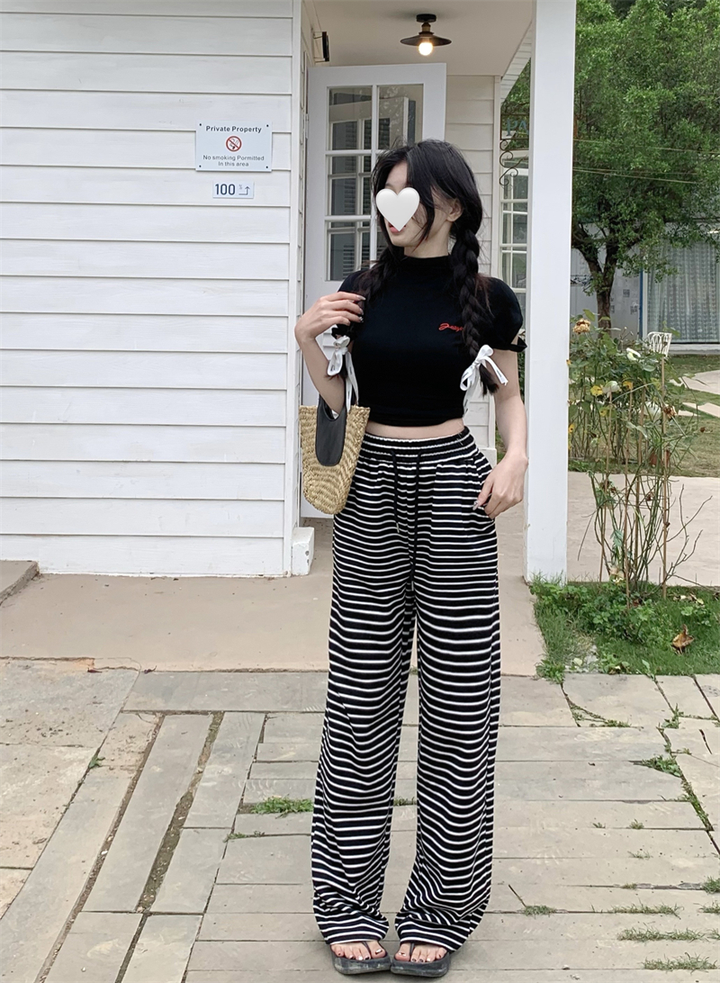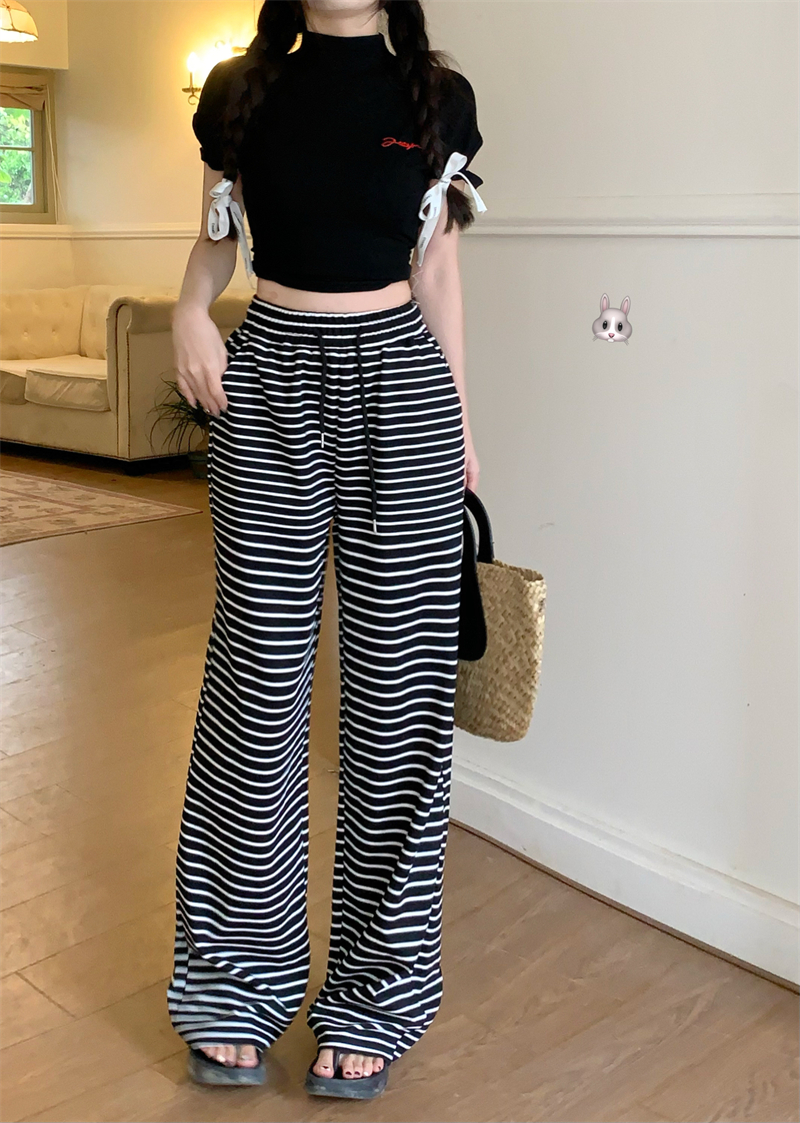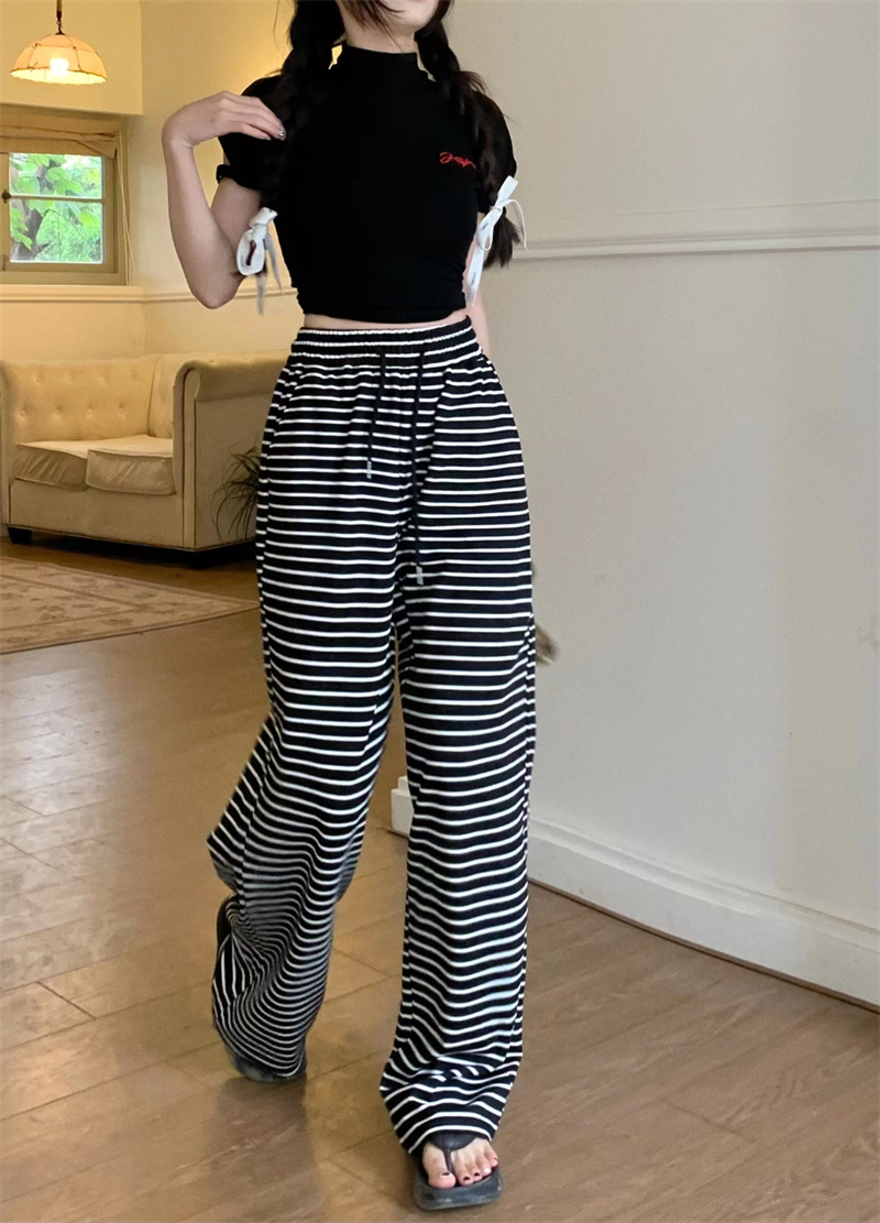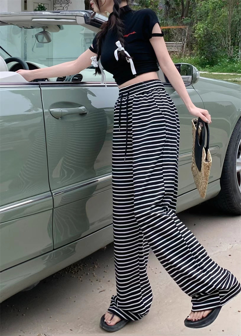 ストライプ ドレープ カジュアルパンツ レディース 夏用 ドラッグ丈 ストレートパンツ ゆったり ハイウエスト ワイドレッグ 散歩用 パンツ ID1724