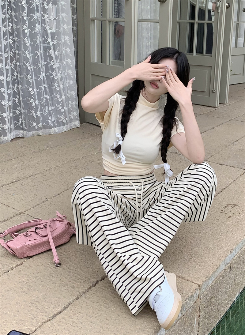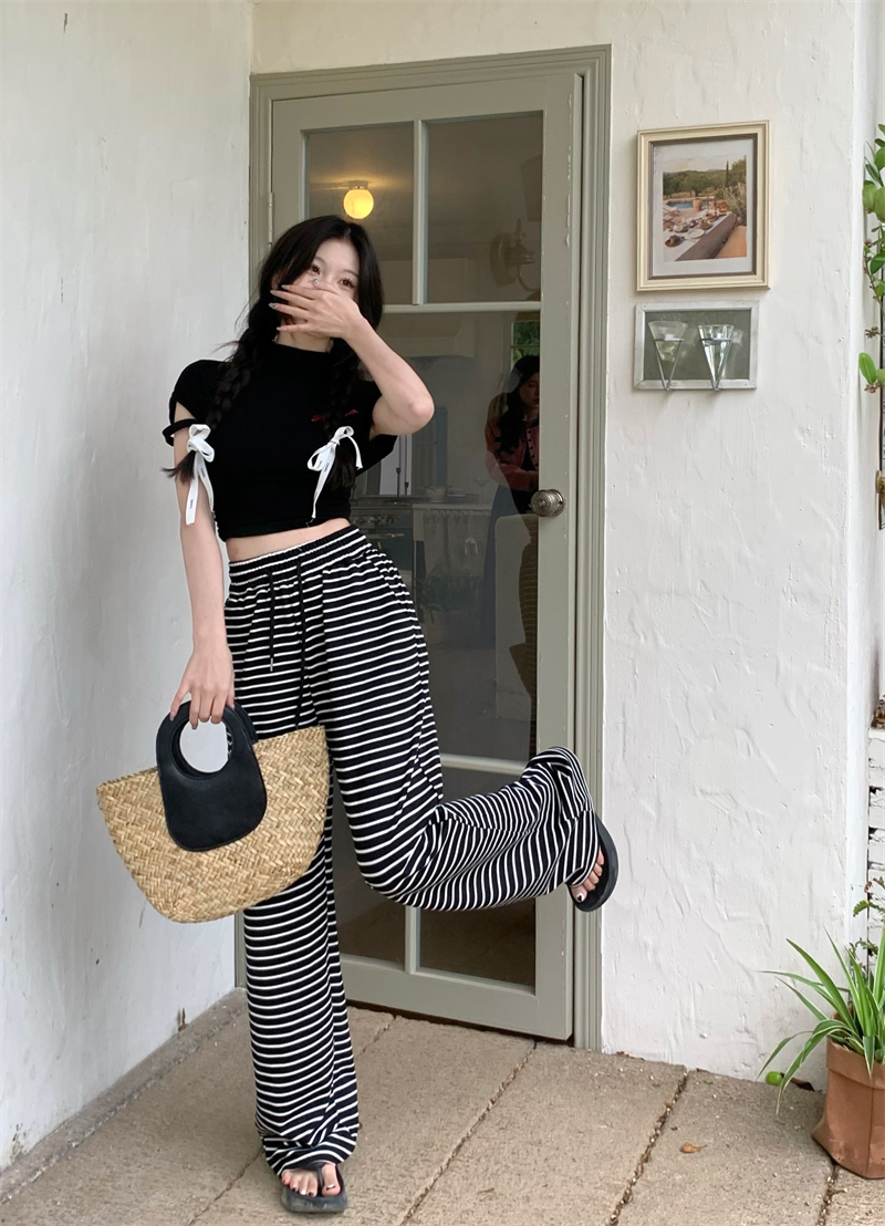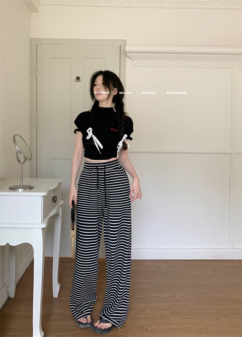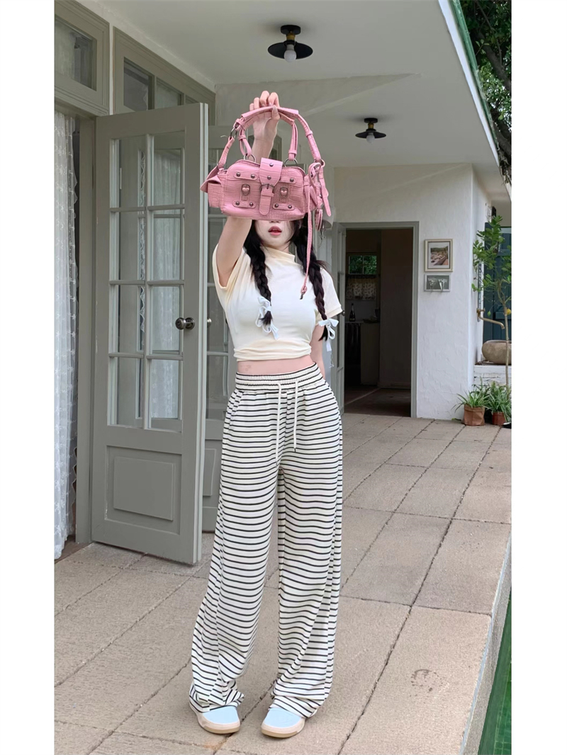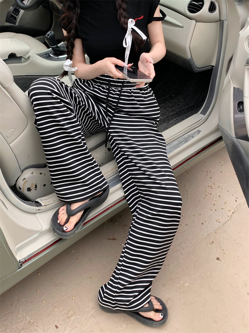 ストライプ ドレープ カジュアルパンツ レディース 夏用 ドラッグ丈 ストレートパンツ ゆったり ハイウエスト ワイドレッグ 散歩用 パンツ ID1724