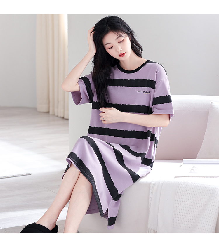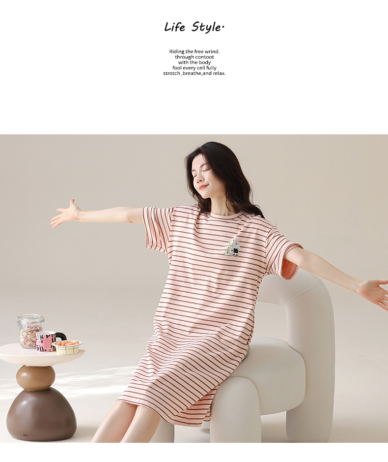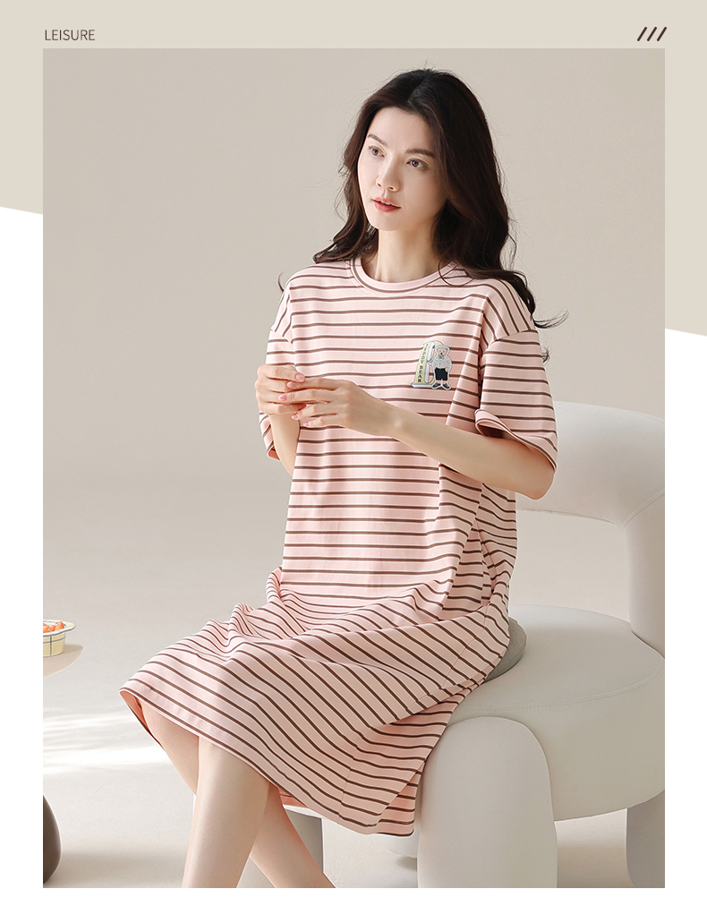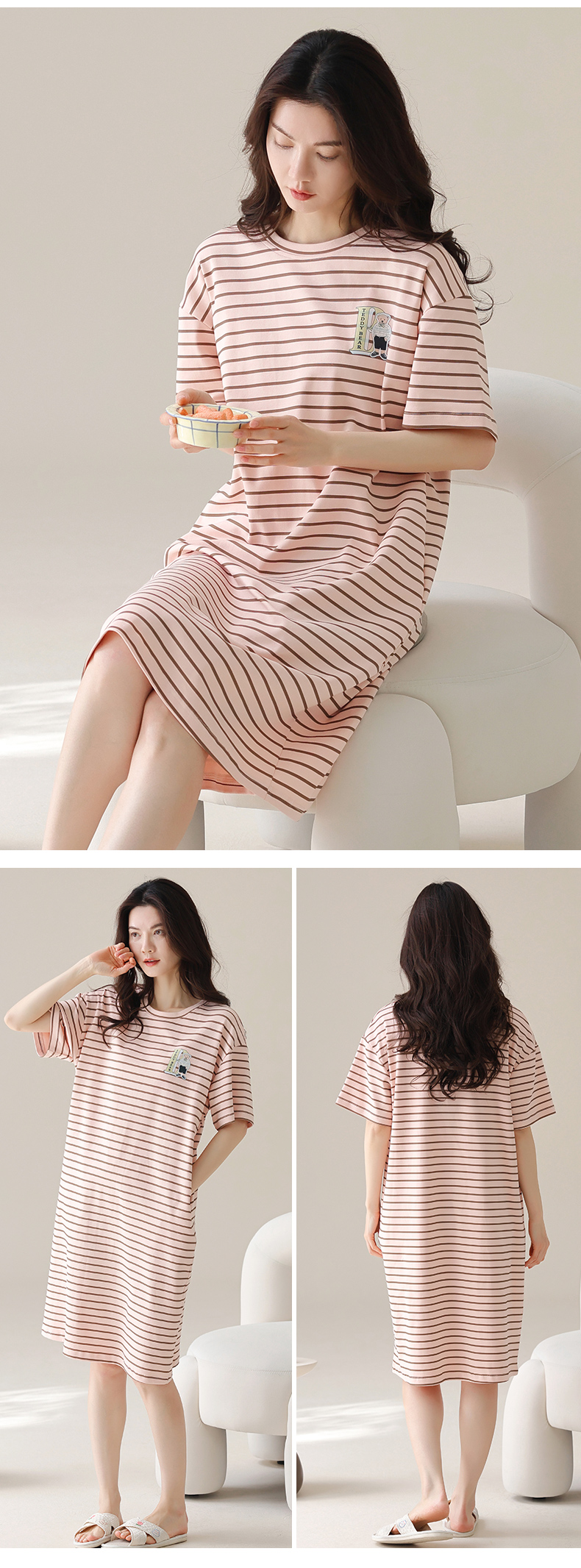半袖 パジャマ レディース 夏用 オールコットン ワンピース ミディアム丈 学生 韓国風 ストライプ 外出可能 家庭用 ID1765