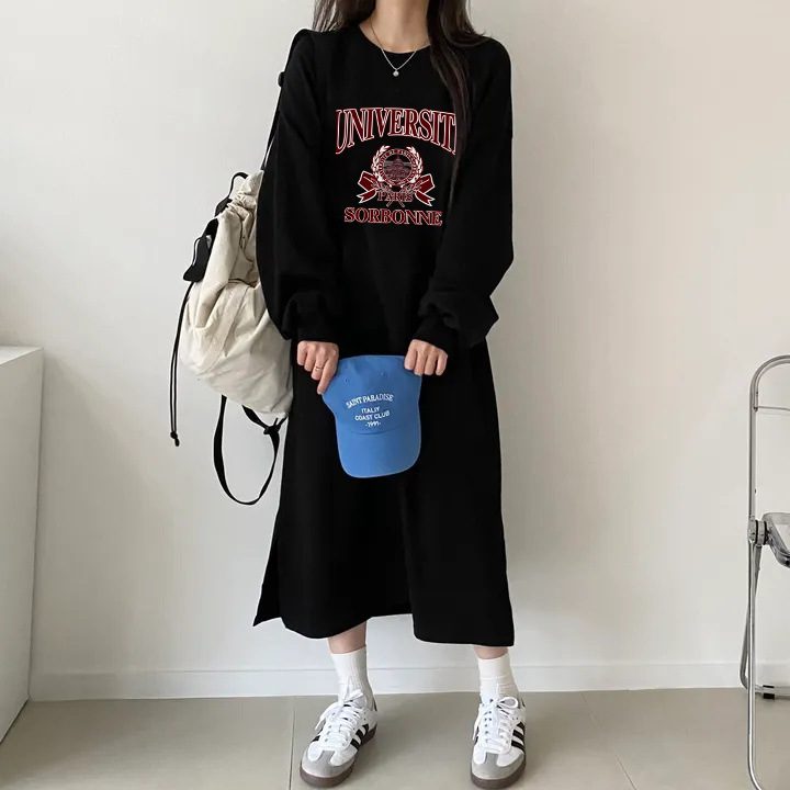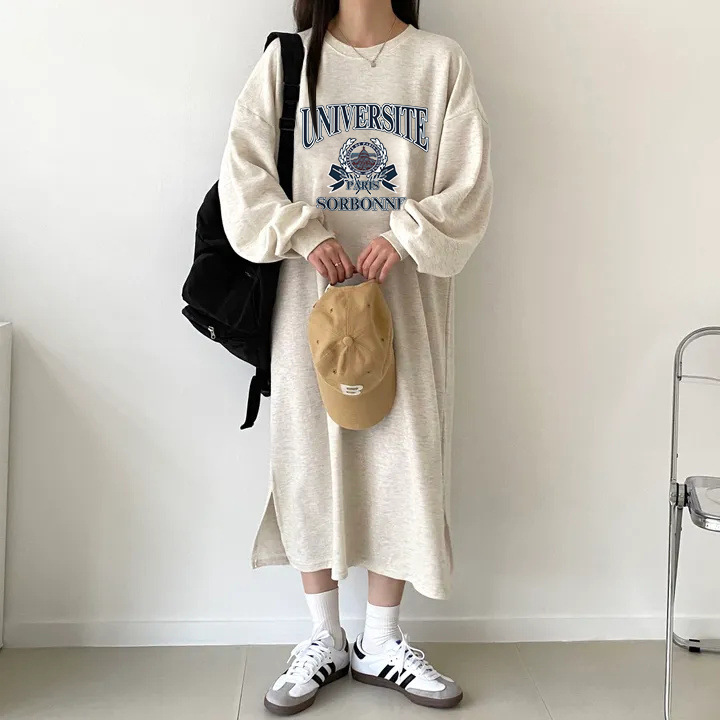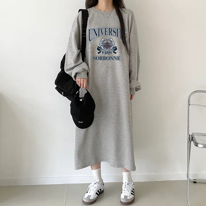 ゆったり シルエット アルファベット 長袖 ロングTシャツワンピース レディース フリース 秋冬 休闲 ワンピース ID2277