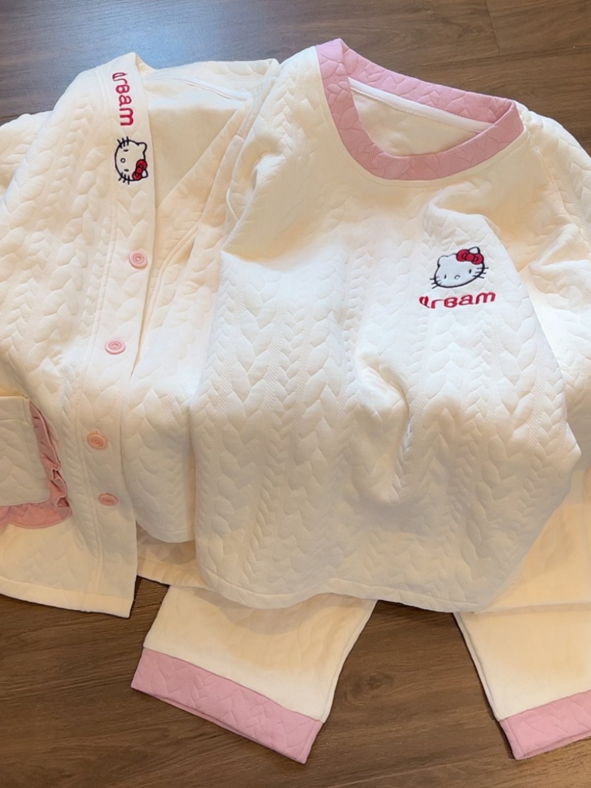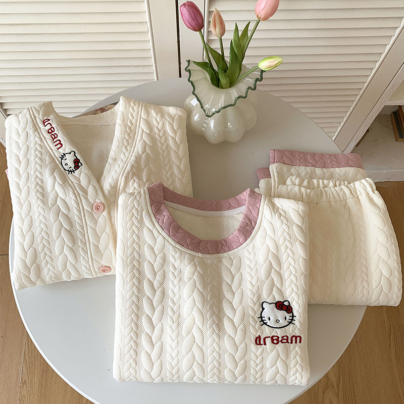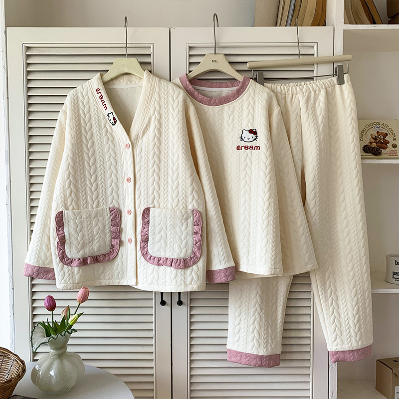 大人気アイテム!3点セット キティ猫 秋冬用 上下セット 長袖 セットアップ エアコットン 中綿 厚手 カートゥーン 部屋着 外出用 レディース ID2541