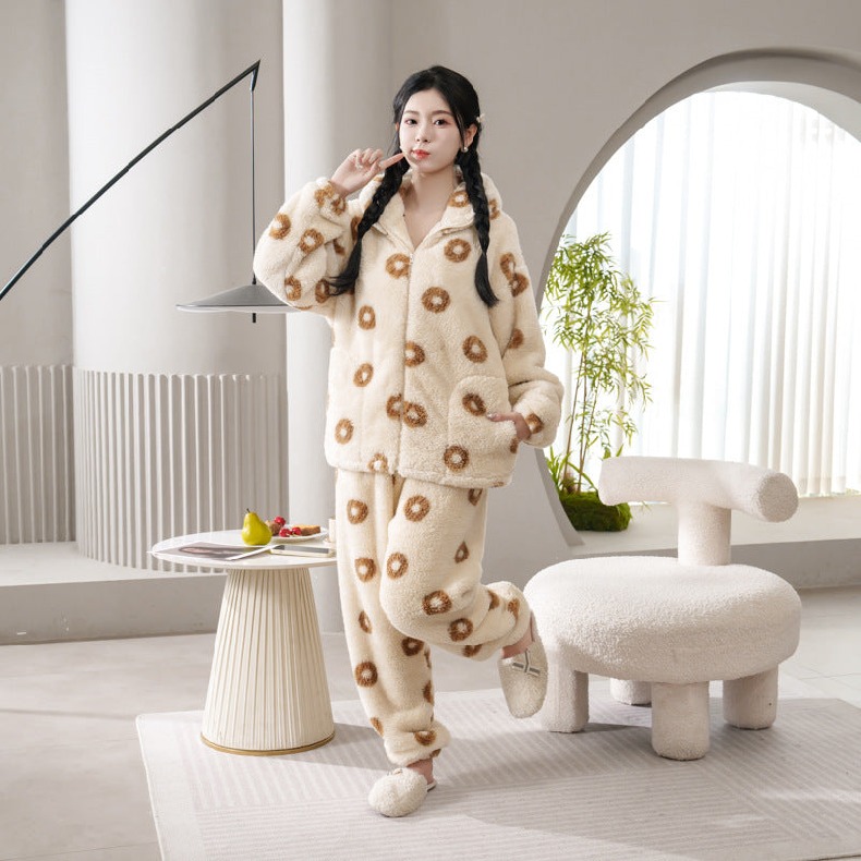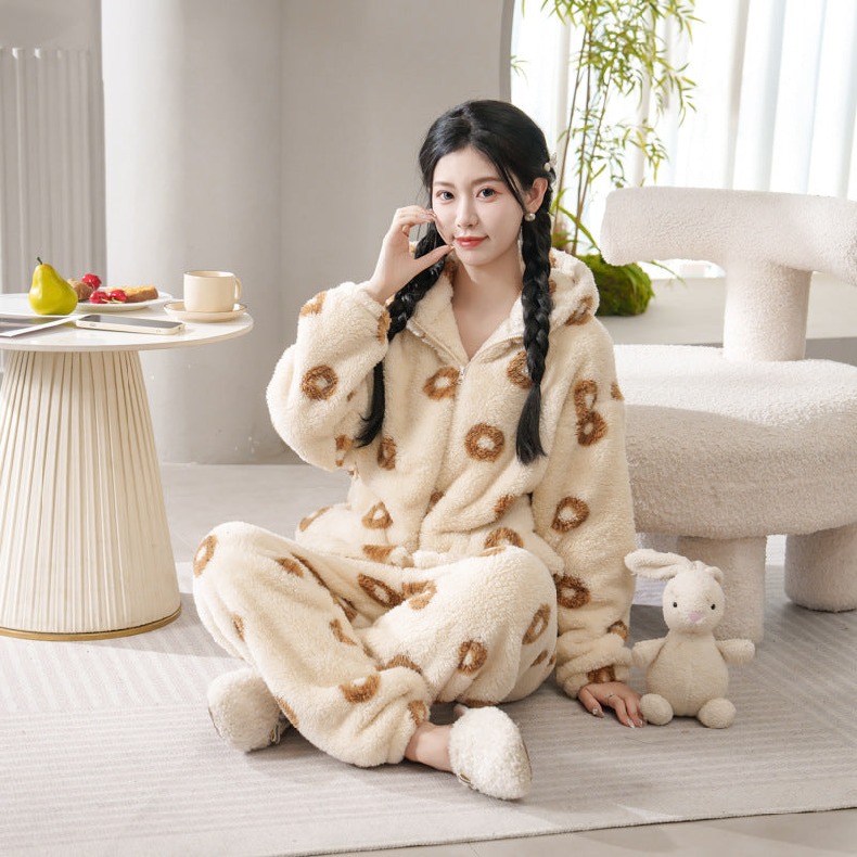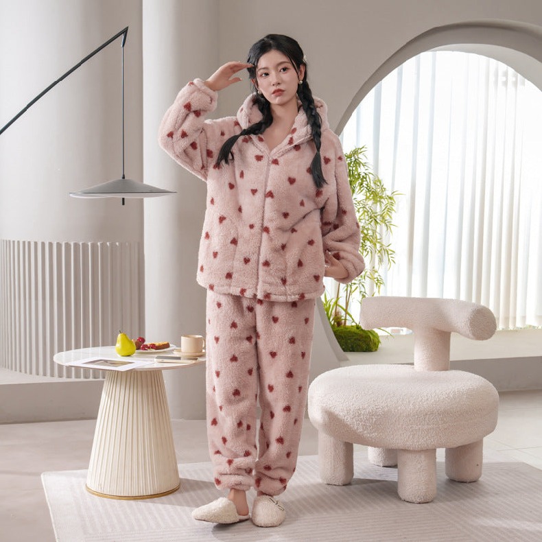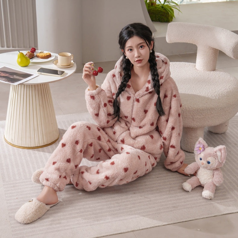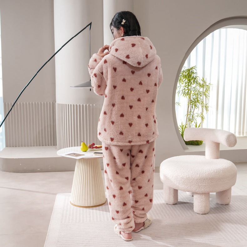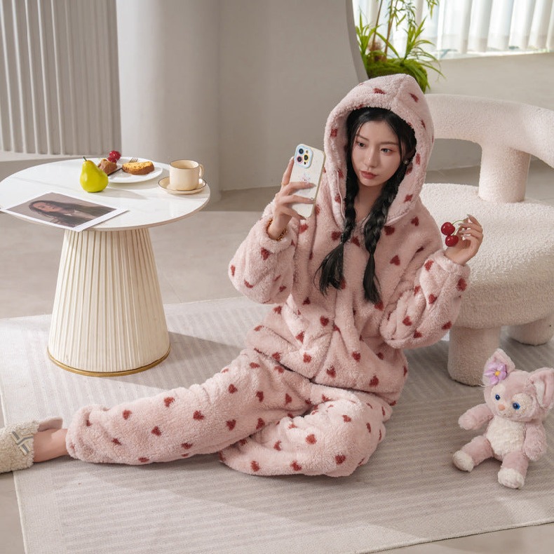 秋冬用 コーラルフリース ルームウェア 加絨 厚手 保温 フード付き パジャマ セットアップ ルームウェア 外出可 ID2578