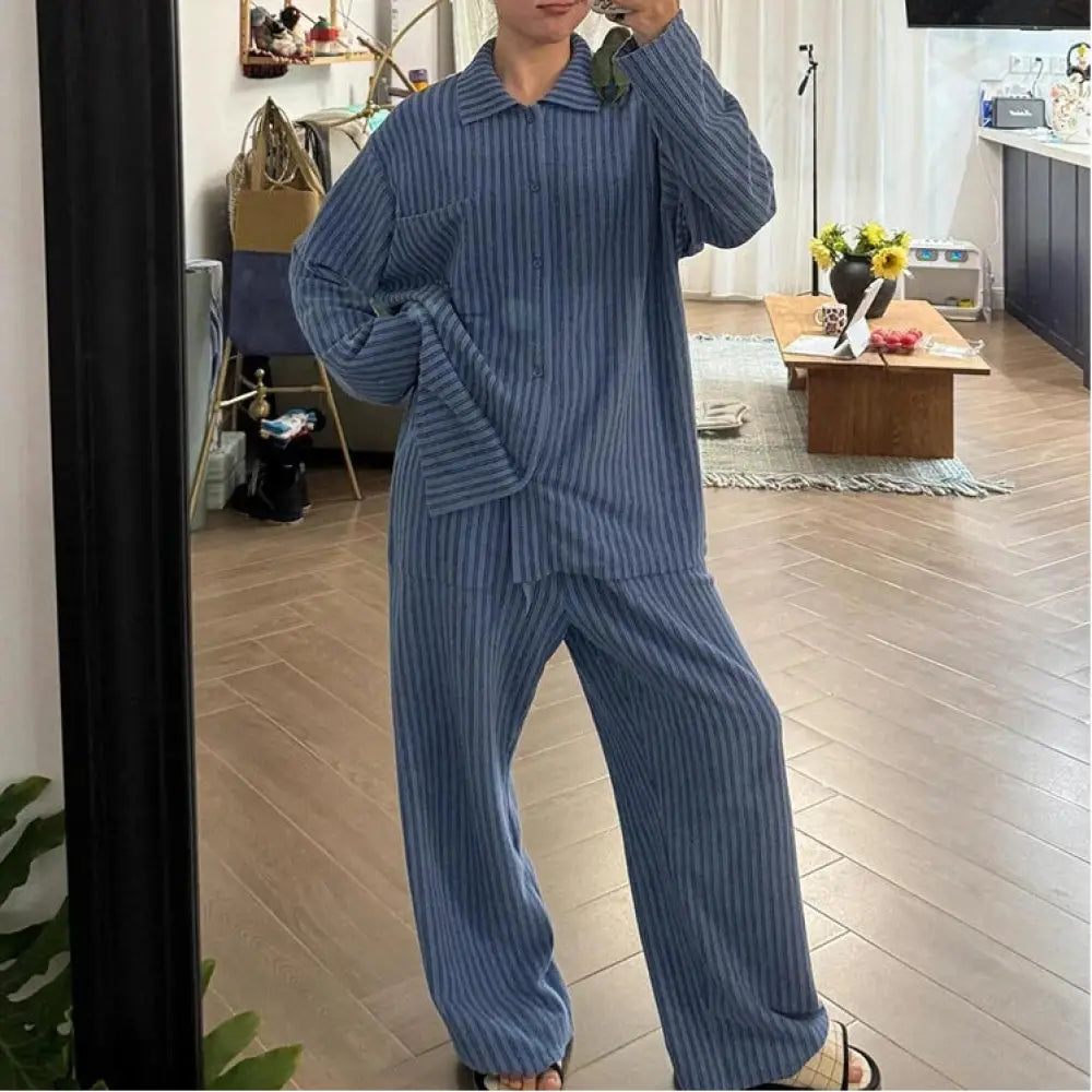 ストライプ デロン パジャマ 女性用 春秋 大きいサイズ ルームウェア セットアップ 前開き セットアップ 外出可能 ID2809