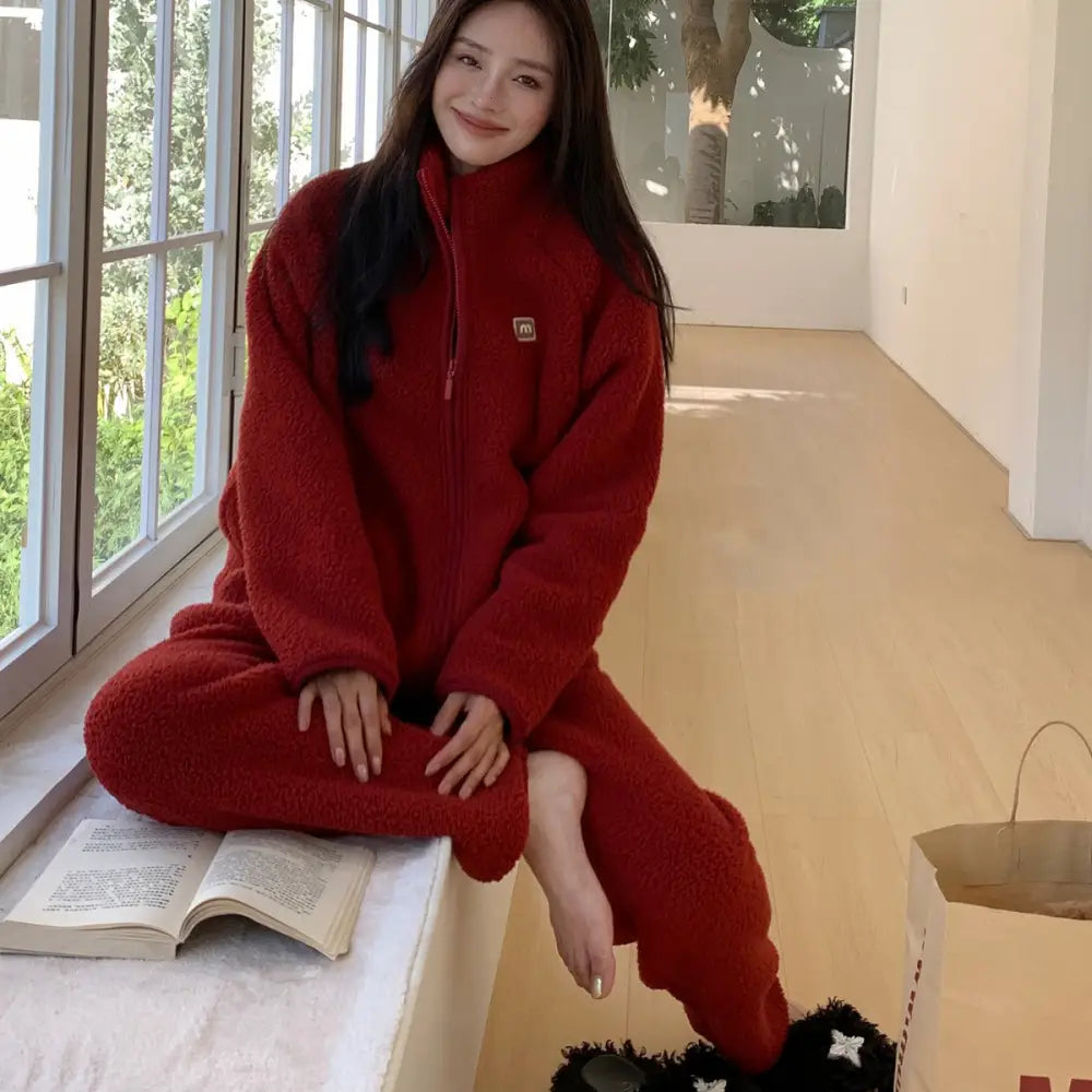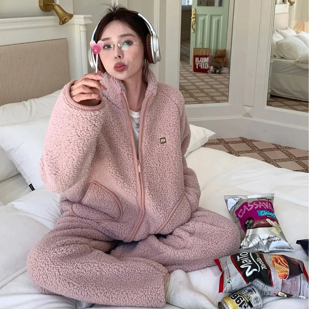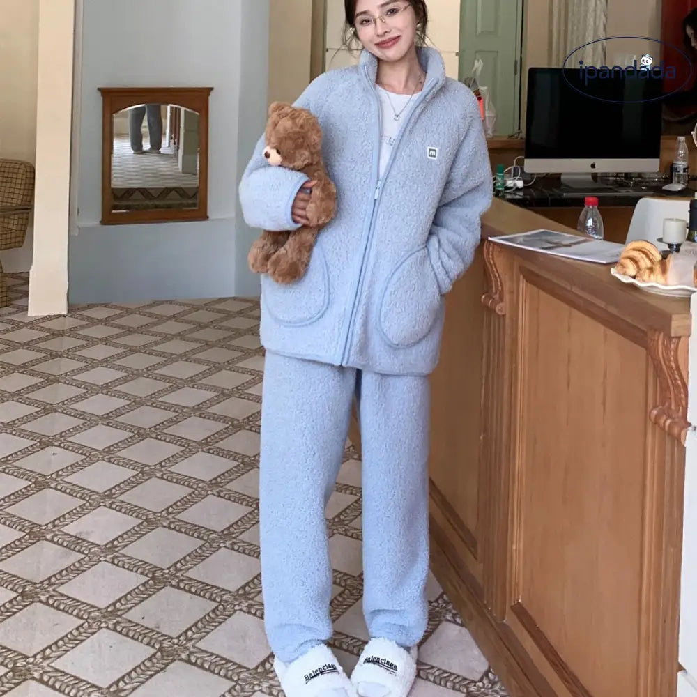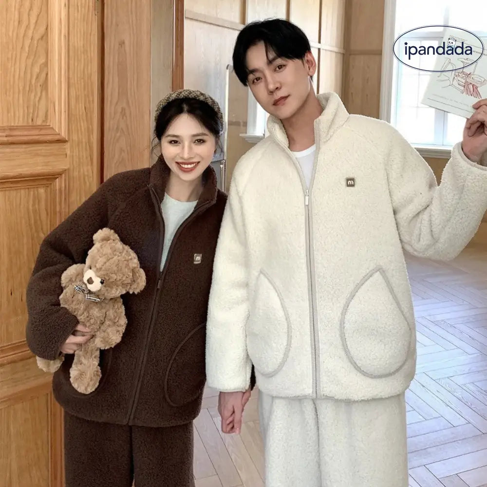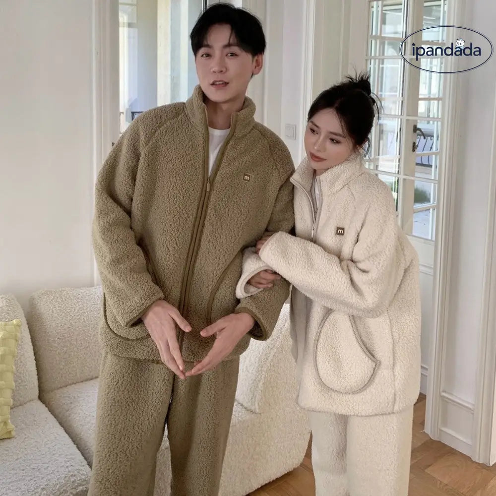 男女兼用 厚手 カップル パジャマ シアリング フリース ルームウェア 女性 冬用 保温 ハイカラー ジップ アウターセット ID2867