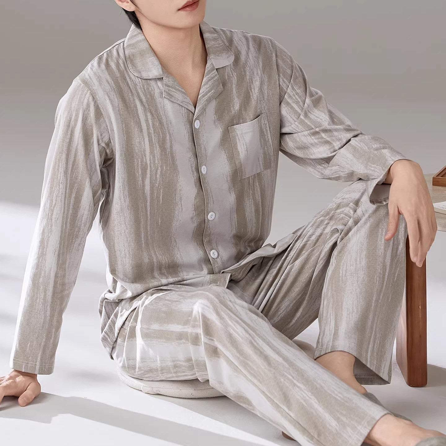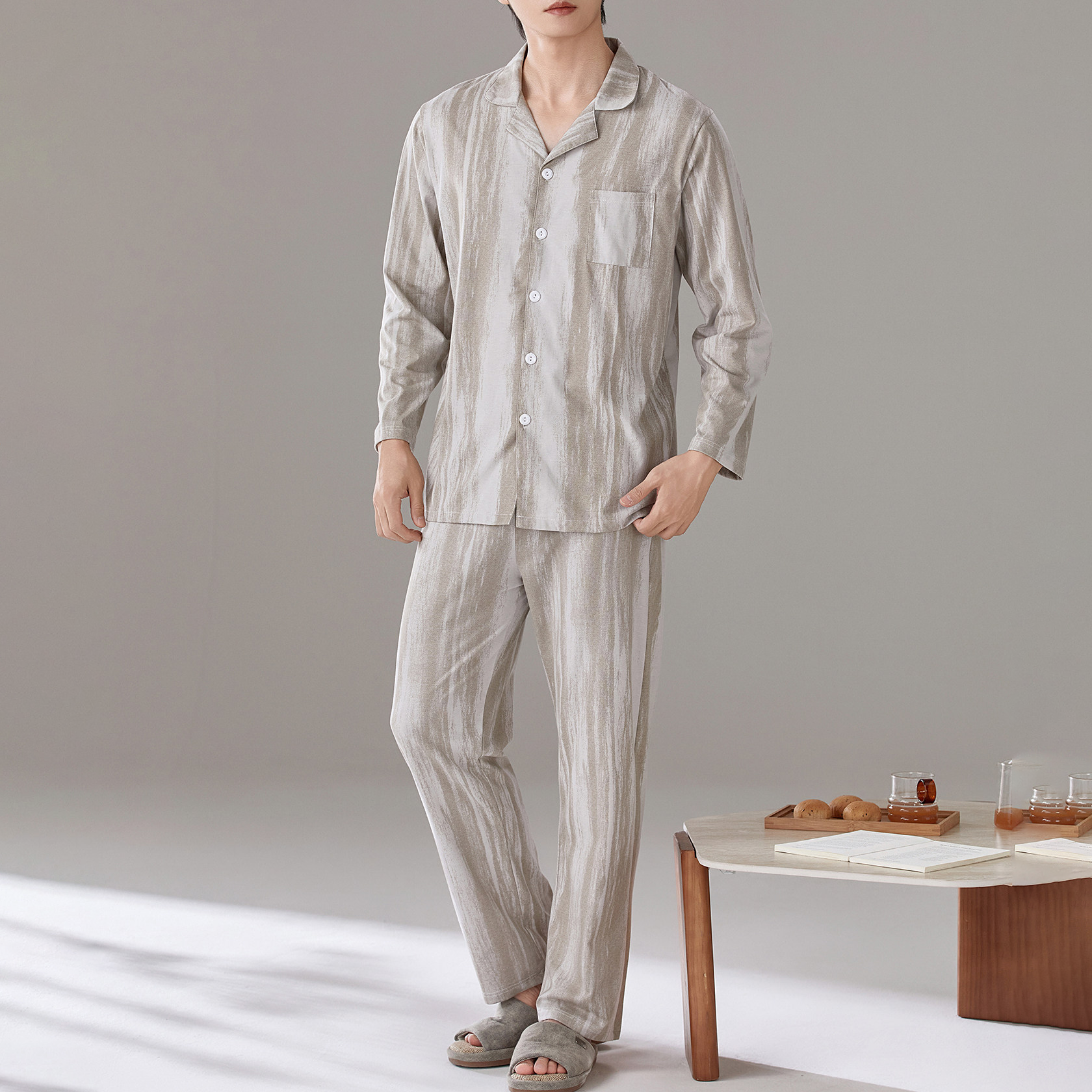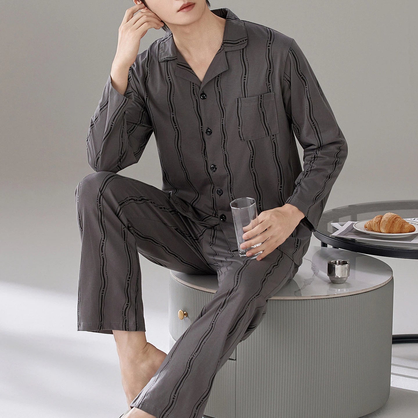 パジャマ メンズ 春秋 綿 長袖 ストライプ ラウンドネック プルオーバー ゆったり カジュアル ルームウェア セット 入院 出産 部屋着 寝巻き ID4282