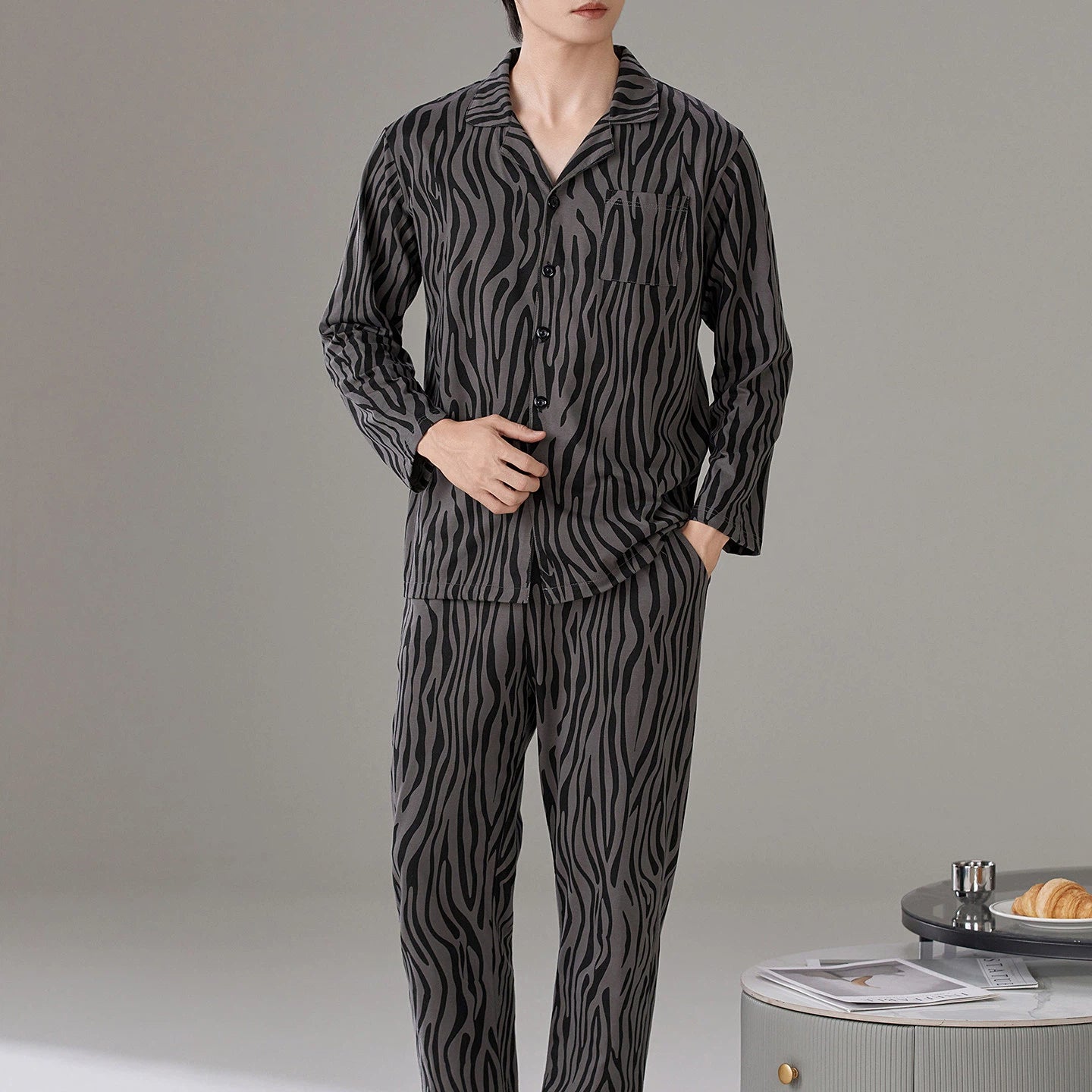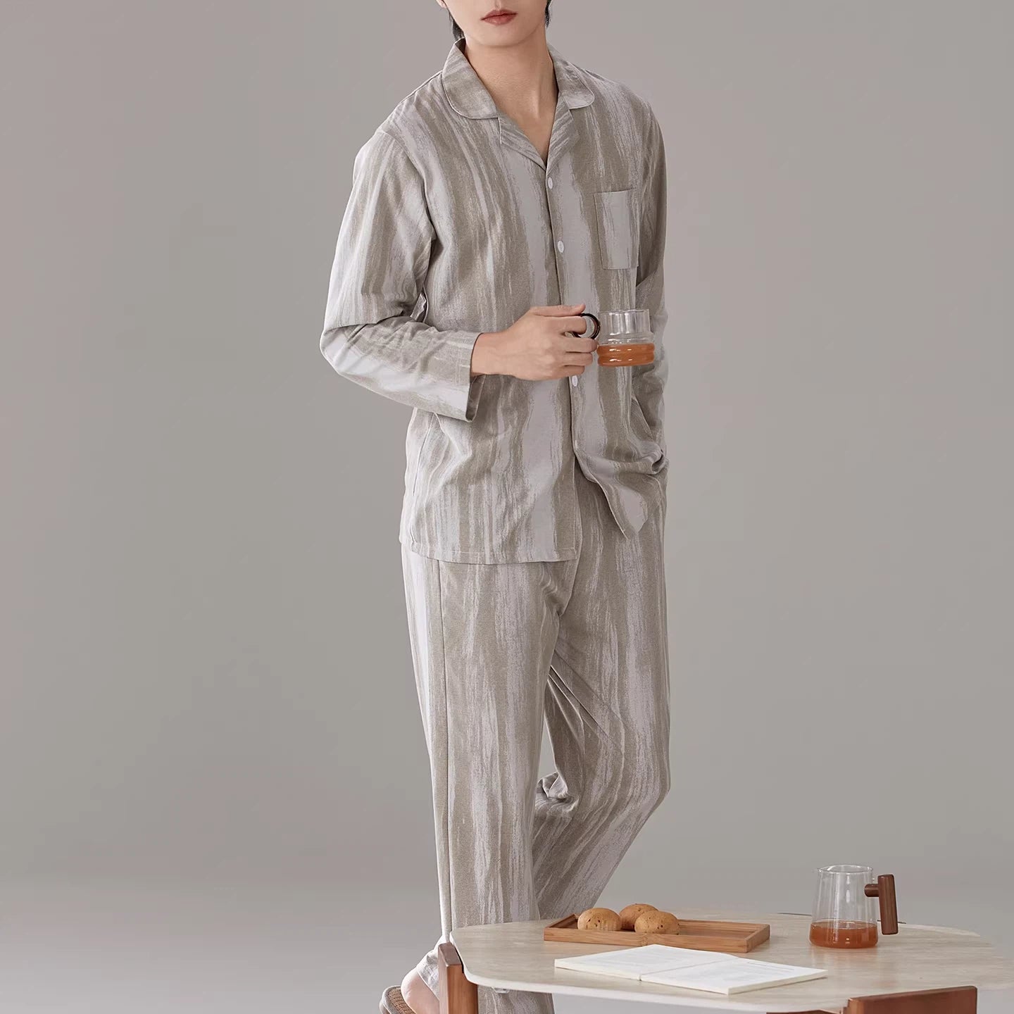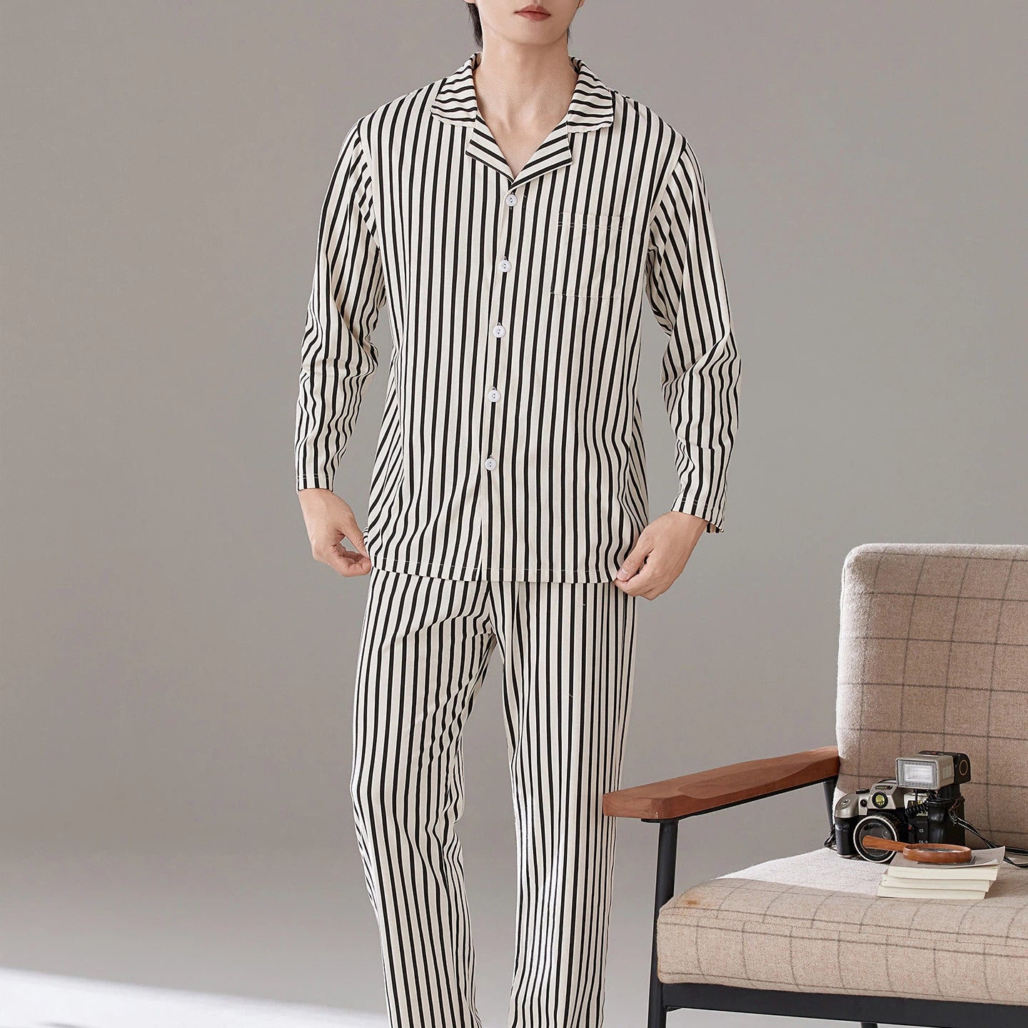 パジャマ メンズ 春秋 綿 長袖 ストライプ ラウンドネック プルオーバー ゆったり カジュアル ルームウェア セット 入院 出産 部屋着 寝巻き ID4282
