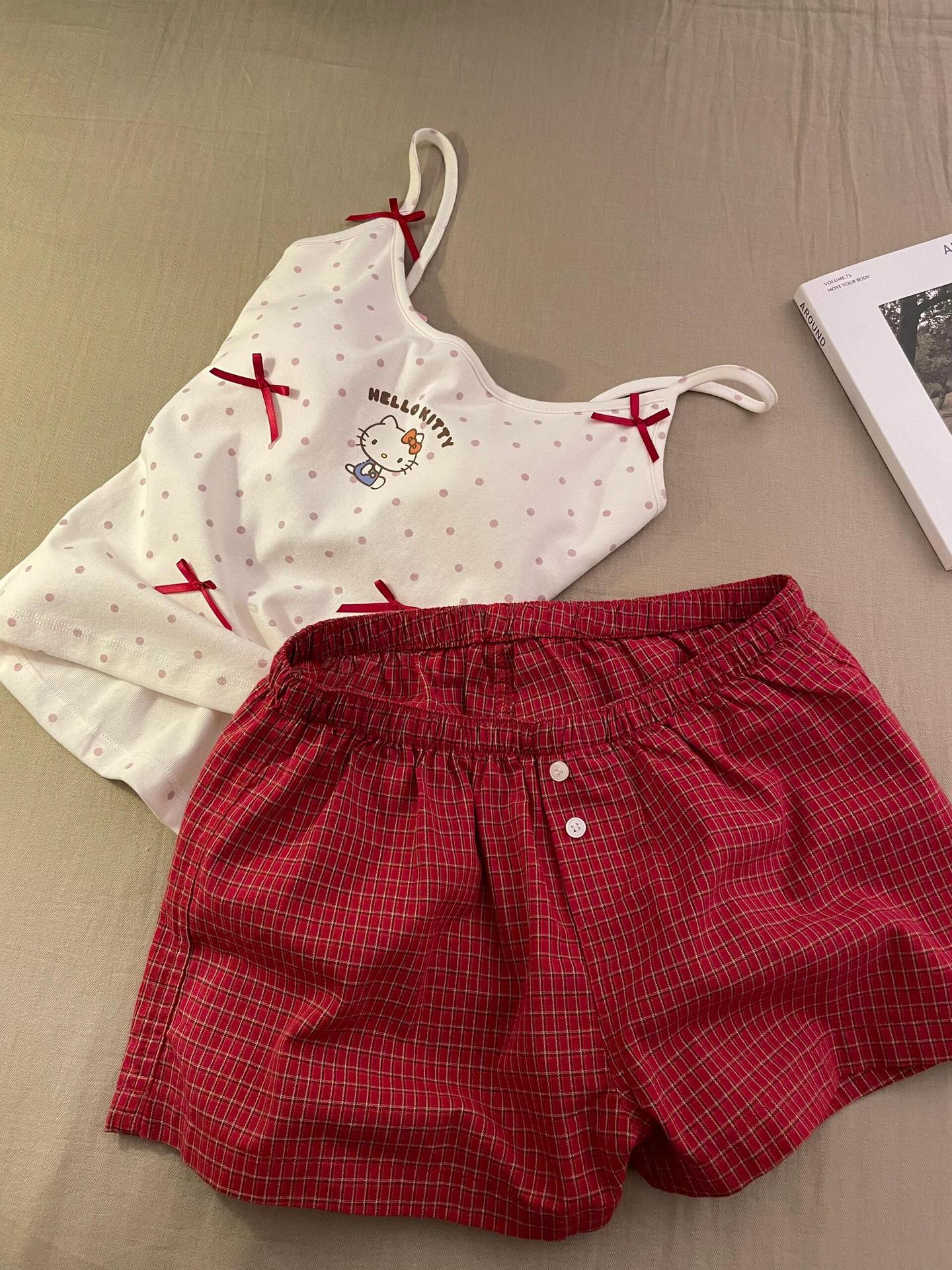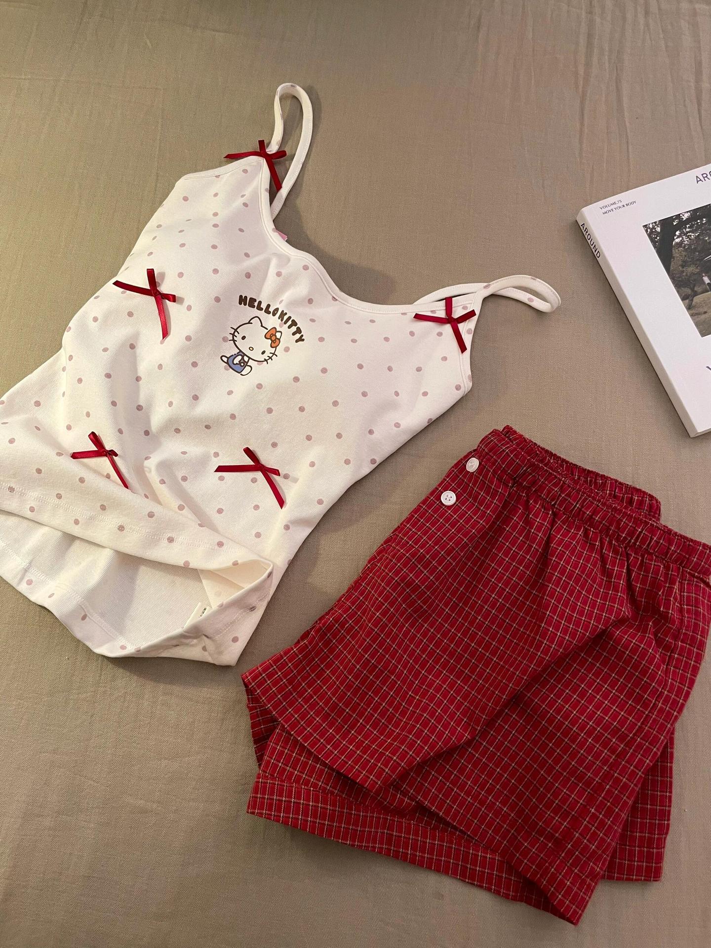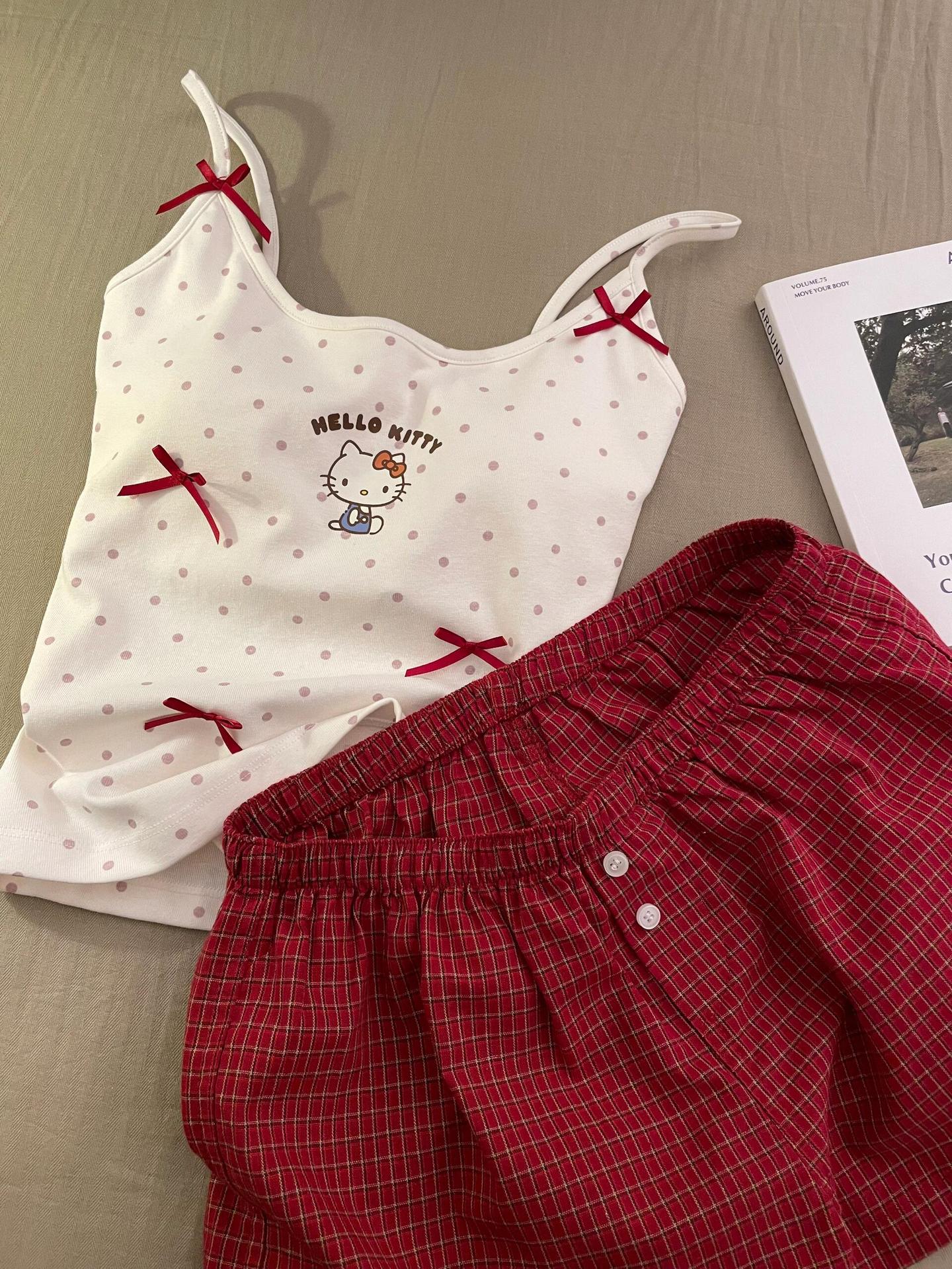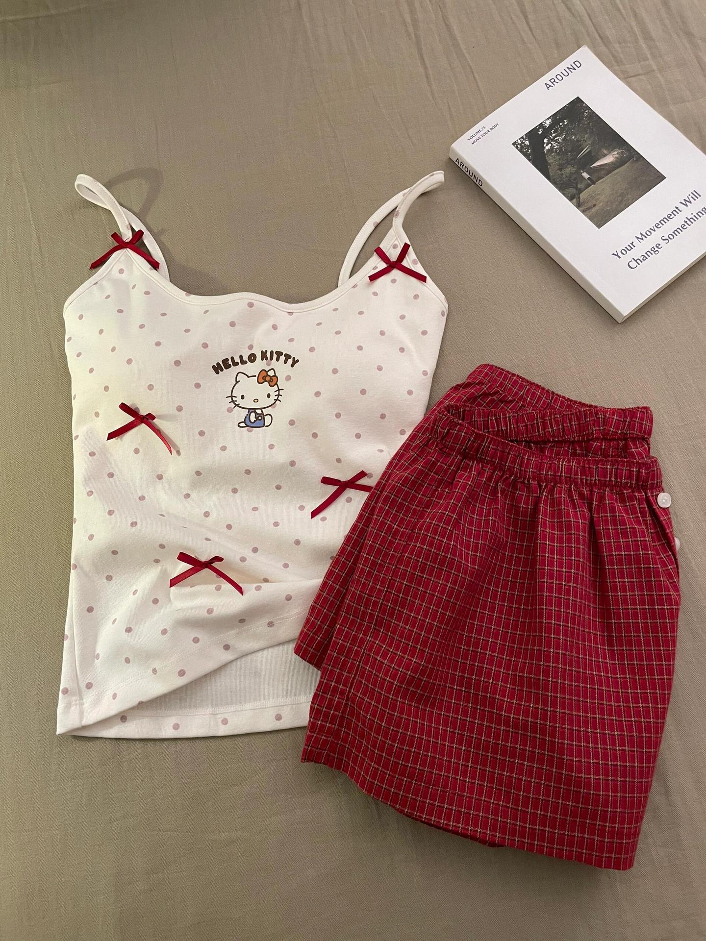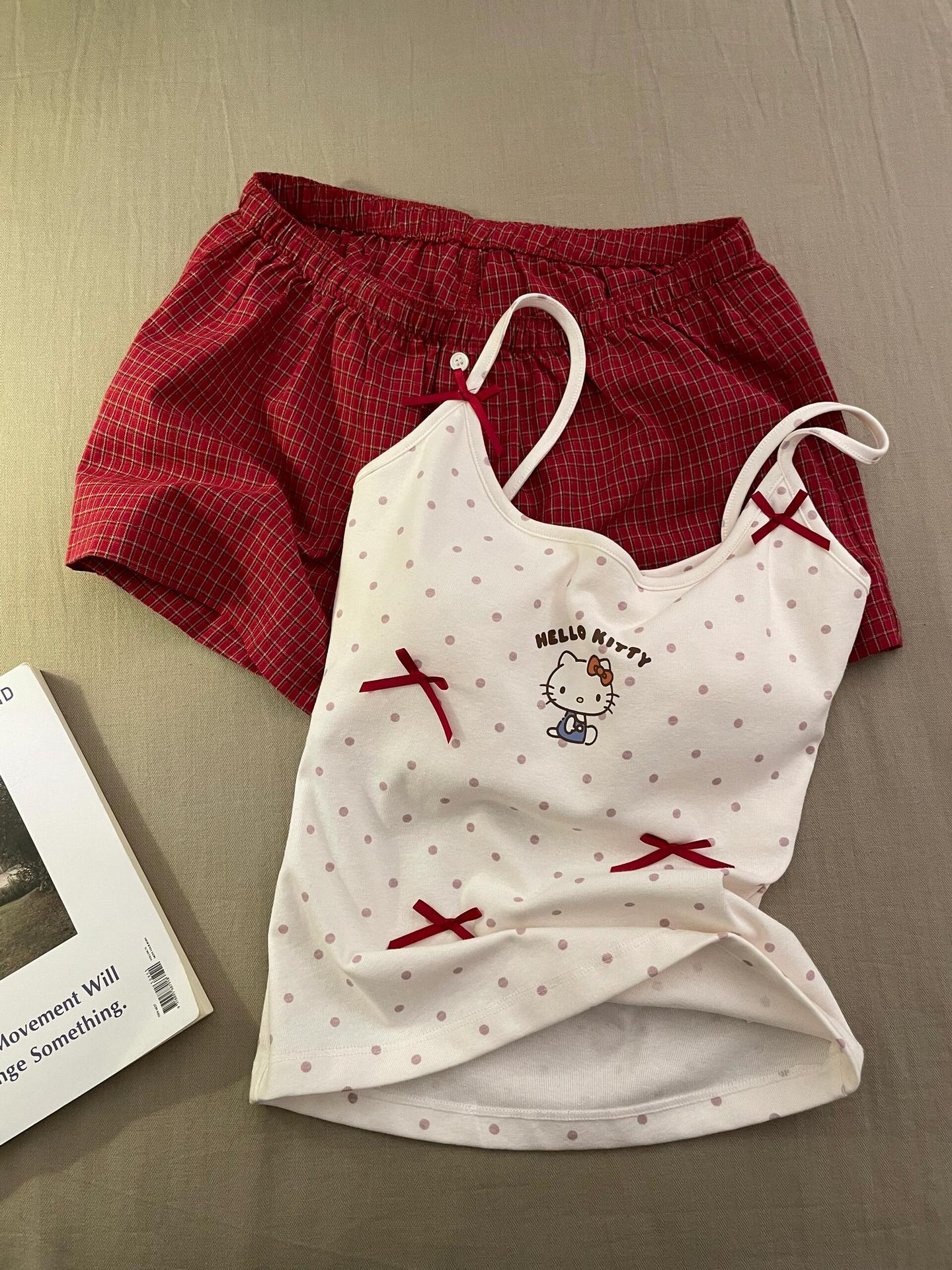キティ猫 ドット柄 プリント キャミソール 胸パッド 付き ショートパンツ セット かわいい ルームウェア シンプル ID620