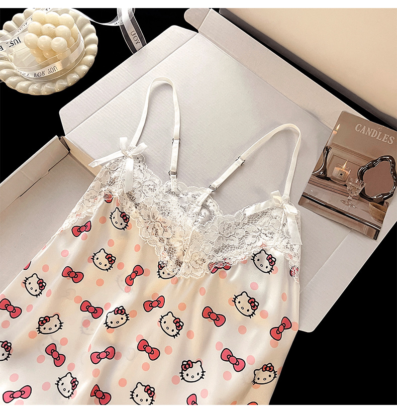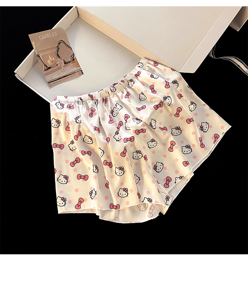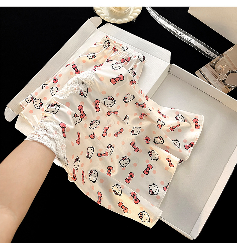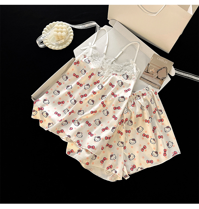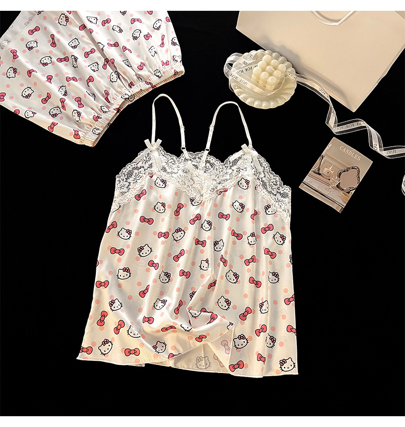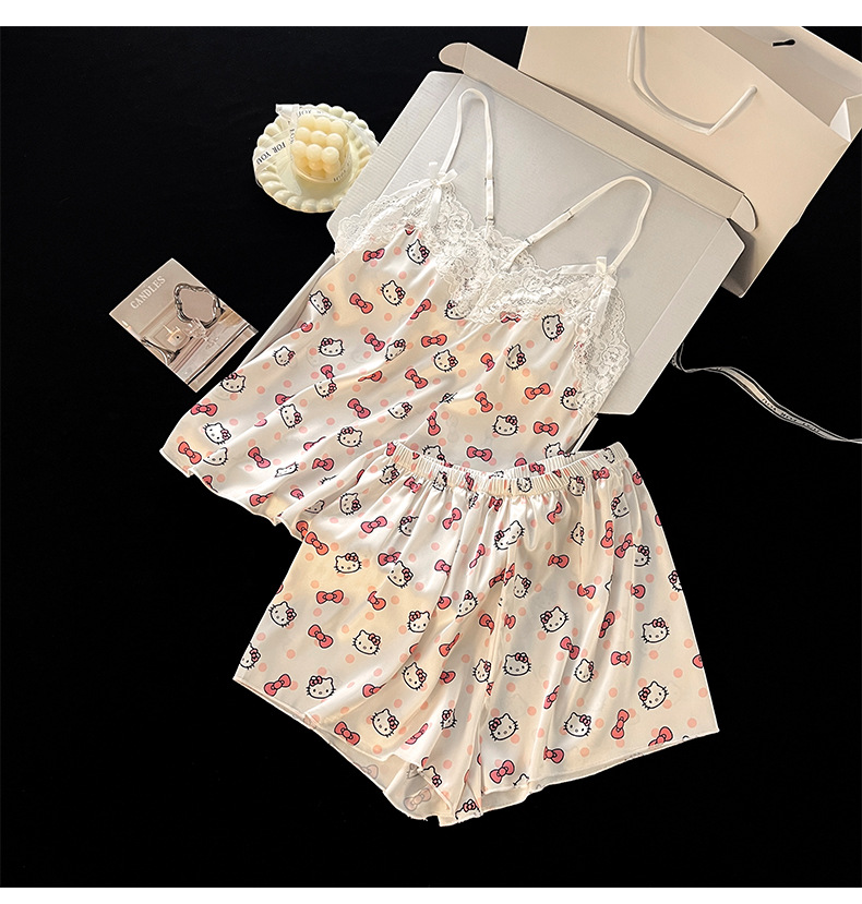 ハローキティ アイスシルク パジャマセット 夏 薄手 レースフリンジ トップ&ショートパンツ ルームウェア ピュア&セクシー ID623