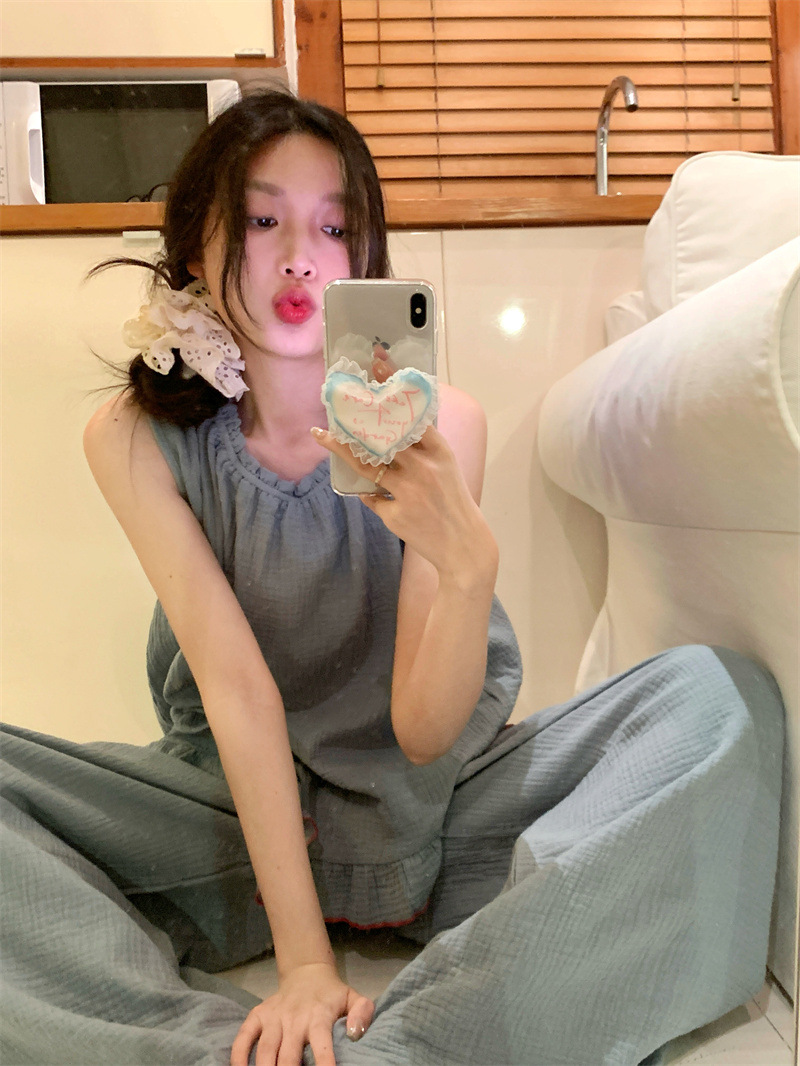 韓国 インスタ レディース 新作 韓国風 ブルー 快適 タンクトップ ロングパンツ ルームウェア パジャマ セット ID752