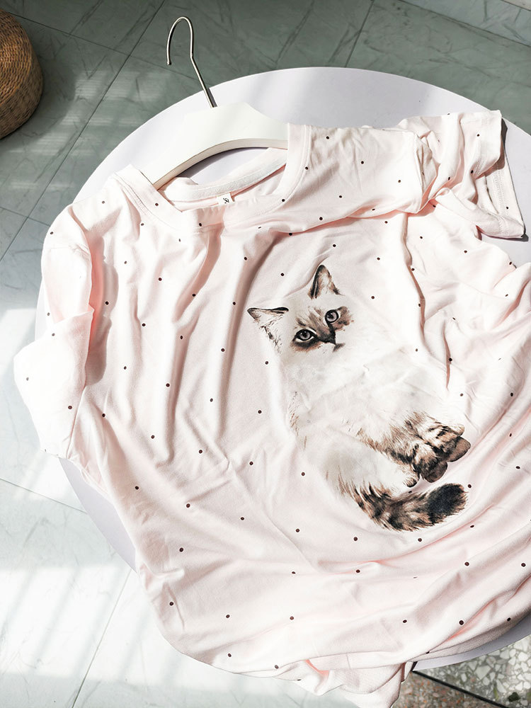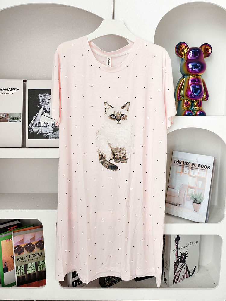 大人気商品!パジャマ レディース 夏 ナイトドレス ワンピース 半袖 薄手 キュート 猫 プリント カジュアル シンプル ルーズ ミディ丈 ホームウェア ルームウェア 部屋着 涼感 快適素材 インテリア 洗濯可能 ID781