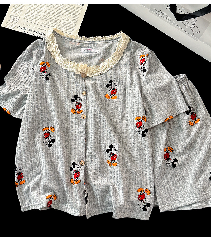 パジャマ レディース 夏 三色 ミッキー プリント 綿 ブラ付き レースフリル 半袖 ショートパンツ セット ホームウェア ルームウェア スイート ヴィンテージ風 おしゃれ 部屋着 ID793