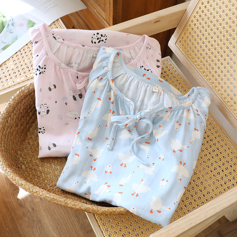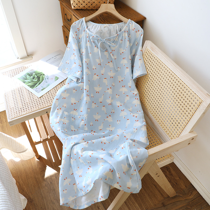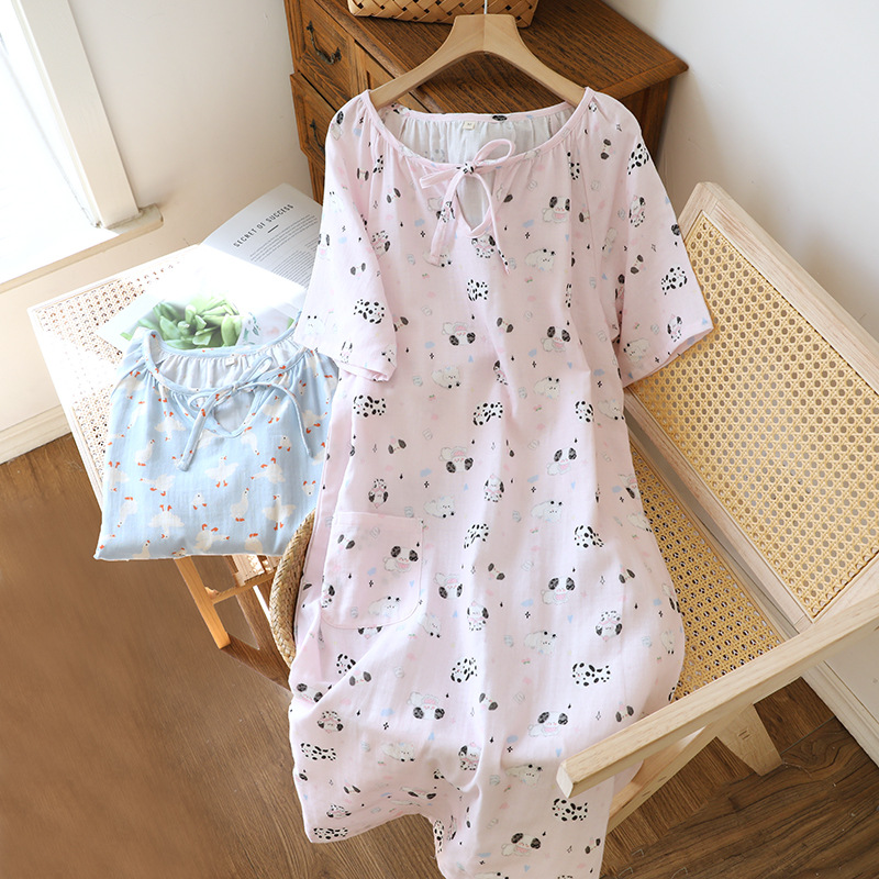 ナイトドレス レディース 春 夏 薄手 綿100% ガーゼ タイストリング 半袖 スイート カートゥーン ルーズ ラウンドネック ホームウェア 外出対応 ルームウェア 部屋着 通気性抜群 肌に優しい ID854