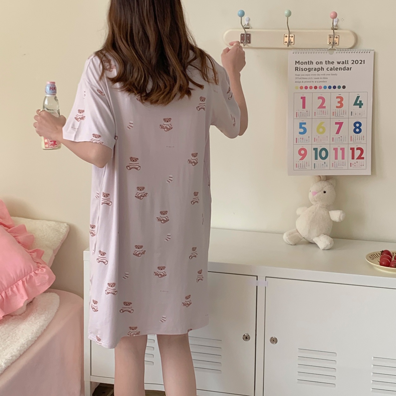 ナイトドレス レディース 夏 新作 モダール くま イラスト 半袖 ホームウェア ルームウェア キュート ソフト 通気性抜群 インスタ風 ID857