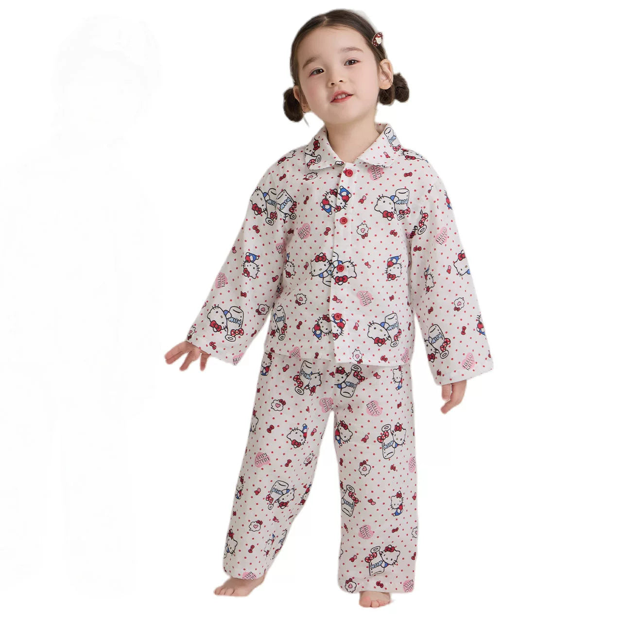ハローキティ パジャマ 女の子 春 ガーゼ ボーダー柄 ストライプ かわいい キャラクター 長袖 前開き カーディガンタイプ 子供 キッズ ルームウェア 部屋着 セットアップ おしゃれ 着回し 便利 入園準備 ギフト ID4240