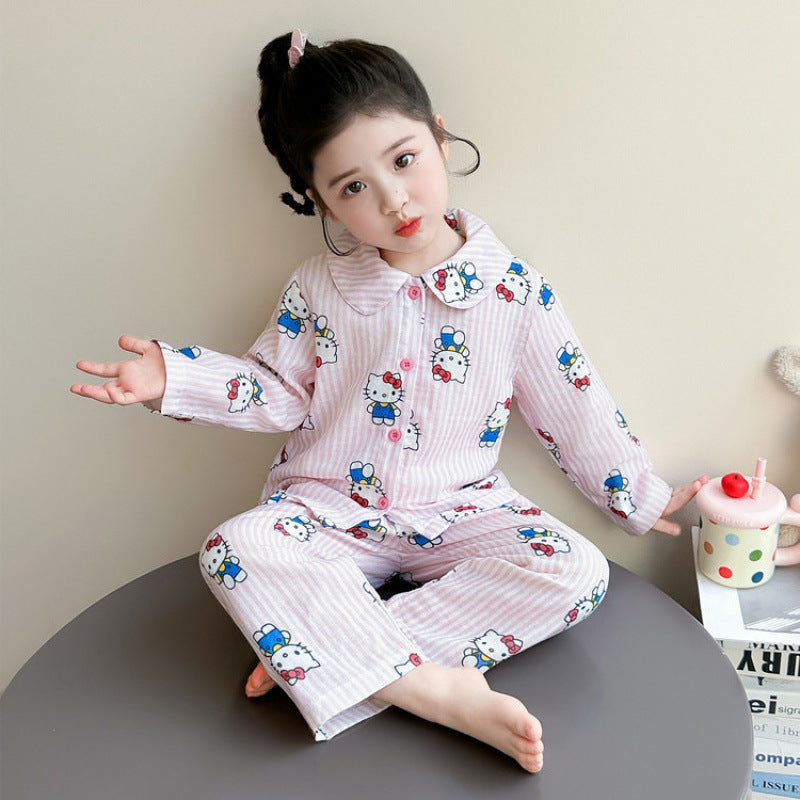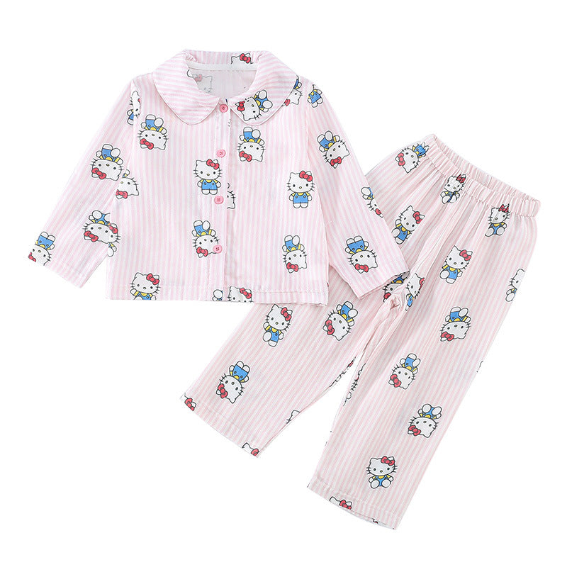 ハローキティ パジャマ 女の子 春 ガーゼ ボーダー柄 ストライプ かわいい キャラクター 長袖 前開き カーディガンタイプ 子供 キッズ ルームウェア 部屋着 セットアップ おしゃれ 着回し 便利 入園準備 ギフト ID4240