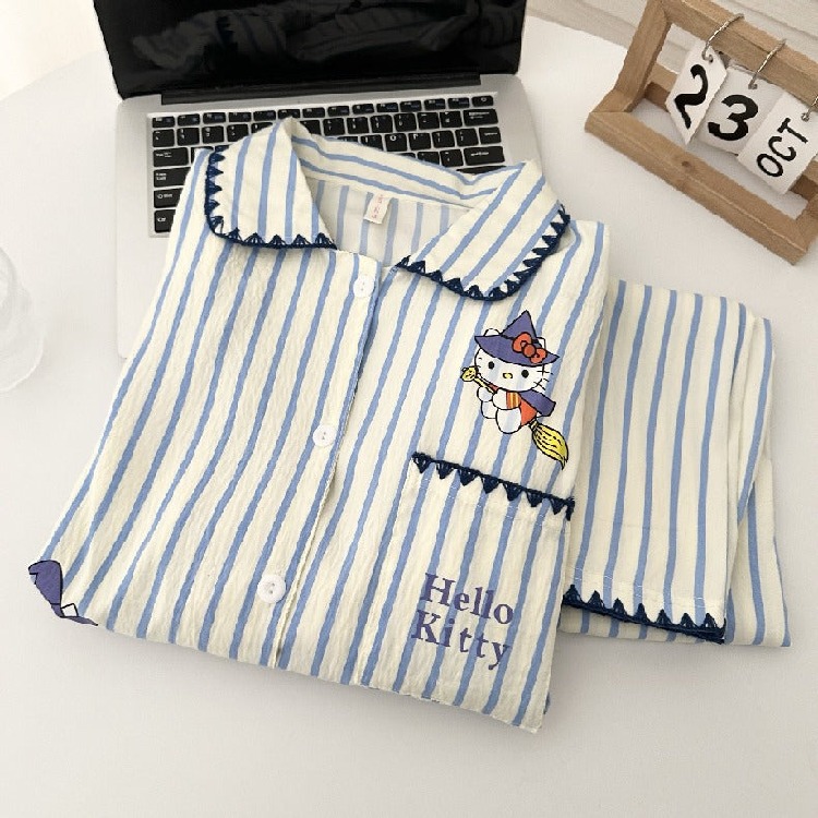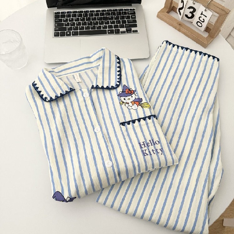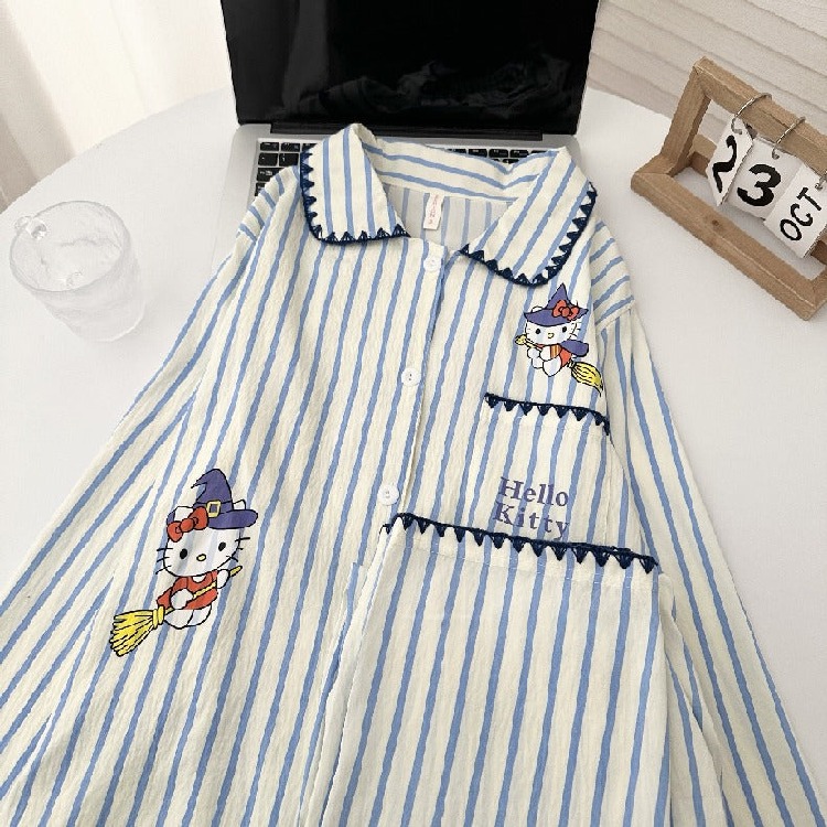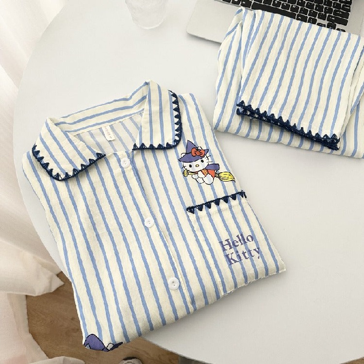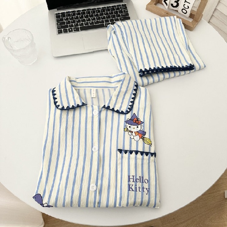 かわいい ストライプ KTキャット コットン パジャマ 女性 春秋用 カーディガン 部屋着 かわいい 可愛い 長ズボン 長袖 ルームウェア セット ID4373